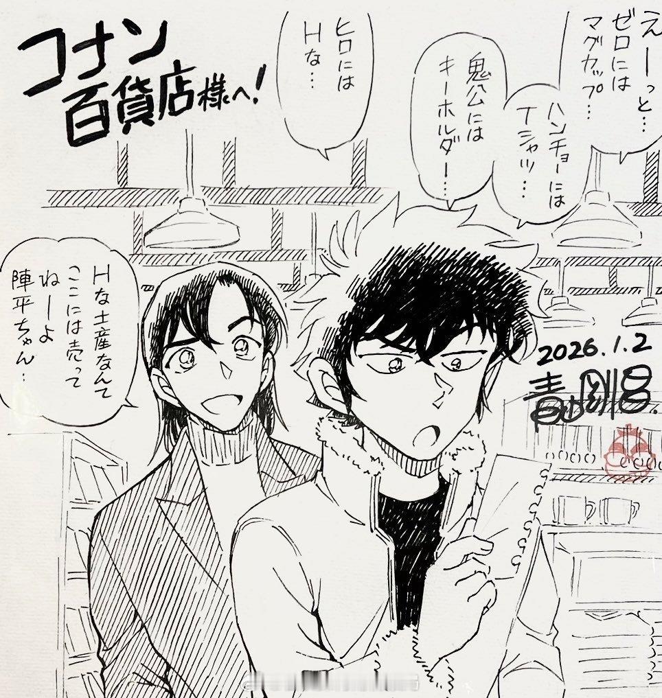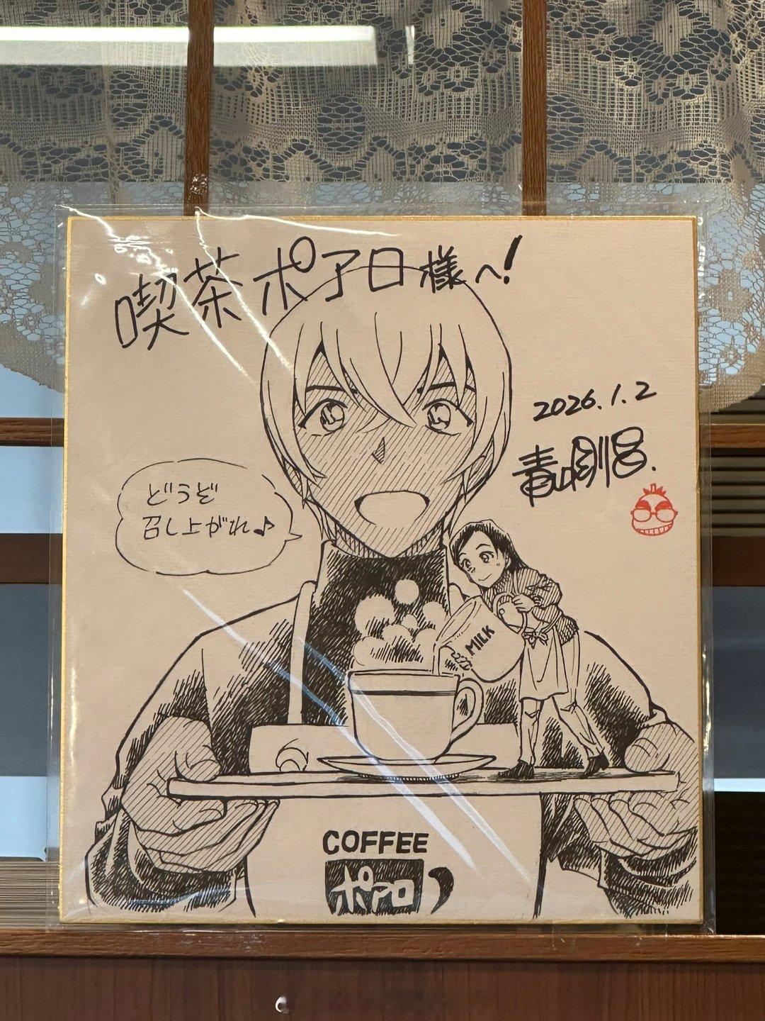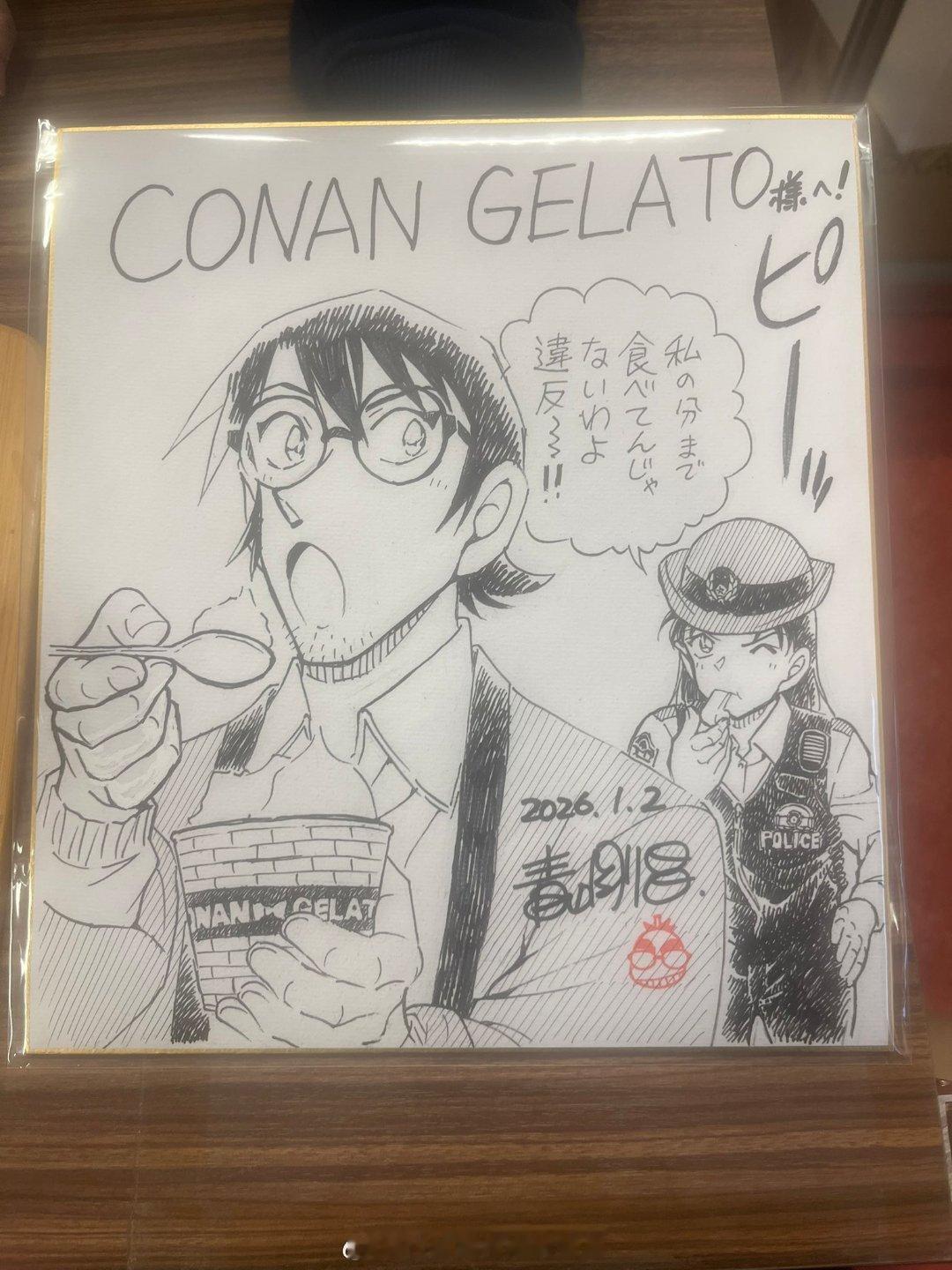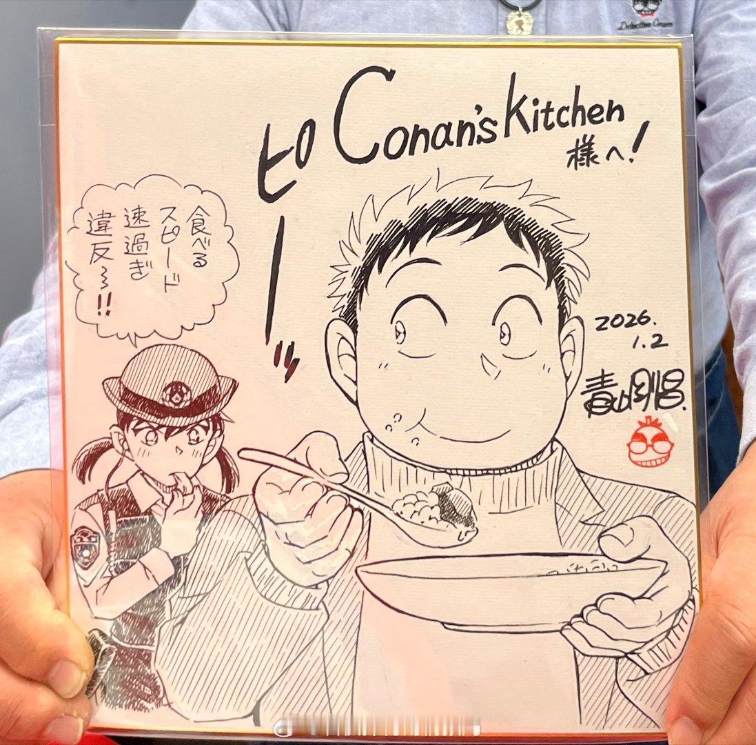 青山刚昌老师2026年最新签绘更新四张!更新①黑羽快斗&中森青子约会名场面 更新②青山刚昌自画头像 更新③江户川柯南头像 更新④怪盗基德头像名侦探柯南