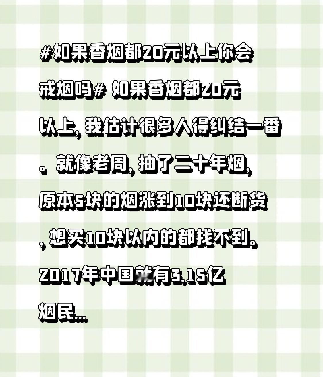 如果香烟都20元以上,我估计很多人得纠结一番。就像老周,抽了二十年烟,原本5块的烟涨到10块还断货,想买10块以内的都找不到。2017年中国就有3.15亿烟民,烟草行业2016年利税超万亿,比军费开支还多。现在低价烟越来越少,要是都20元以上,钱包肯定受不了。不过戒烟哪有那么容易,对老烟民来说就像割肉。有人会咬咬牙戒了,但也有不少人会勒紧裤腰带继续抽。我觉得,就算涨价也只能影响一部分人,完全靠涨价戒烟不太现实。