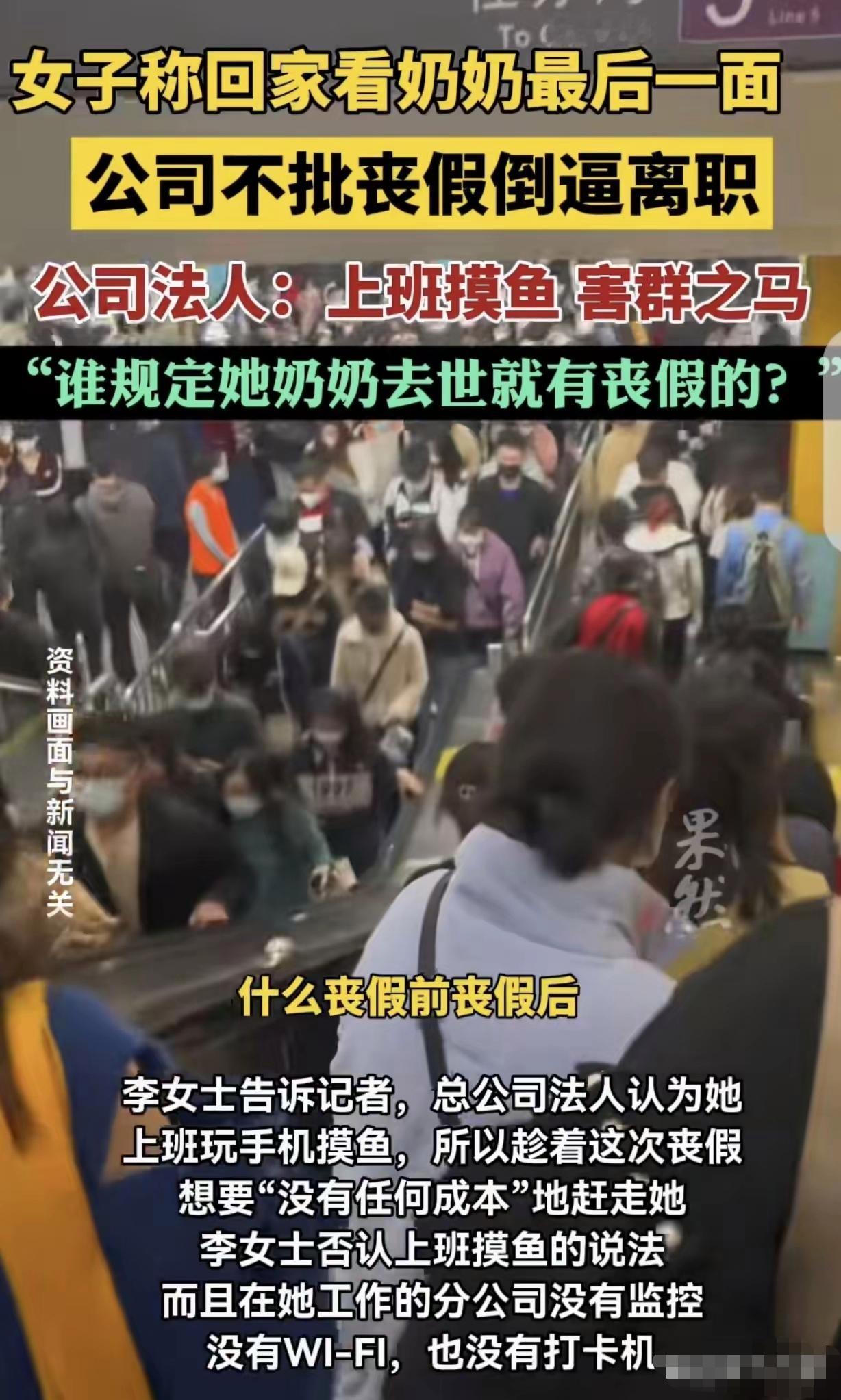 比周扒皮还狠!奶奶弥留等见最后一面,女子请假奔丧竟被开除,法人:摸鱼的害群之马! 江苏常熟这事儿,看得人拳头都硬了! 2026年1月1日,齐鲁壹点曝出的一则新闻,直接戳中了无数打工人的肺管子。 李女士在当地一家公司做文员,总部远在苏州。这天,一通家里的电话让她瞬间崩溃——从小疼她爱她的奶奶快不行了,就剩最后一口气,就盼着能见孙女最后一面。 心急如焚的李女士,立刻向公司经理和人事申请5天假,只想回去送奶奶一程。 可谁能想到,就在她怀着满心悲痛坐上高铁的那一刻,人事的电话追了过来,冷冰冰的一句话让她如坠冰窟:公司法人林先生不同意请假,要么自己主动辞职,要么就等着被开除! 一边是血脉至亲的最后告别,一边是来之不易的工作饭碗,李女士陷入了两难的境地。 走投无路的她,只能选择妥协,卑微地问人事:那我不请假了,现在回去上班行不行? 得到的回复,却更让人心寒:不行,回来也得办自动离职,不然就按开除处理! 李女士瞬间醒悟,这哪里是不准请假,分明是公司想借着这个由头,零成本把她赶走! 更过分的是,法人林先生为了给开除找借口,竟然张口就来,栽赃陷害:“她天天上班摸鱼,哪个企业能容得下这种害群之马?谁规定奶奶去世就有丧假的?我就是要开除她!” 这番话,简直是颠倒黑白! 李女士当场反驳:公司里既没有WiFi,也没有监控,连打卡机都没有,你到底是哪只眼睛看到我摸鱼了? 是啊,没有任何证据,仅凭一句随口捏造的“摸鱼”,就要毁掉一个打工人的生计,这操作,实在是太恶毒了! 李女士自认工作兢兢业业,从不迟到早退,分内之事做得妥妥帖帖,对得起这份薪水,更对得起自己的良心。 忍无可忍的她,直接一纸诉状申请了劳动仲裁,并且已经收到了1月29日的开庭通知。她要为自己讨回公道,要让这家无良公司付出代价! 而面对李女士的维权,法人林先生非但没有半分心虚,反而放狠话:法庭上见分晓! 这事儿一出,瞬间激起了全网的愤怒。 很多人都知道,按照现行规定,爷爷奶奶去世确实没有明确的法定丧假,但这绝不代表员工不能请事假!《劳动法》明确赋予了劳动者因特殊情况请假的权利,企业理应酌情批准。 更何况,这是奶奶弥留之际的最后心愿,是最基本的人伦情理。死者为大,这么简单的道理,这家公司的法人难道不懂吗? 从法律层面来讲,这家公司的操作更是漏洞百出。 《劳动合同法》第39条规定,只有劳动者严重违反规章制度、严重失职给公司造成重大损害时,用人单位才能解除劳动合同。可这家公司拿不出任何证据证明李女士“摸鱼”,所谓的开除理由根本站不住脚。 公司逼迫李女士自动离职,本质上就是为了规避支付经济补偿金,这种行为已经构成了违法解除劳动合同,李女士完全有权要求公司支付赔偿金。 法律是底线,人情是温度。一家连最基本的人情味都没有的企业,就算一时钻了空子,又能走多远呢? 我们支持李女士维权到底!也希望所有打工人都能记住:遇到这种无良老板,千万别忍气吞声,一定要拿起法律的武器,保护好自己的合法权益! 你觉得这家公司的做法合理吗?遇到这种事你会怎么处理?欢迎在评论区留言讨论!