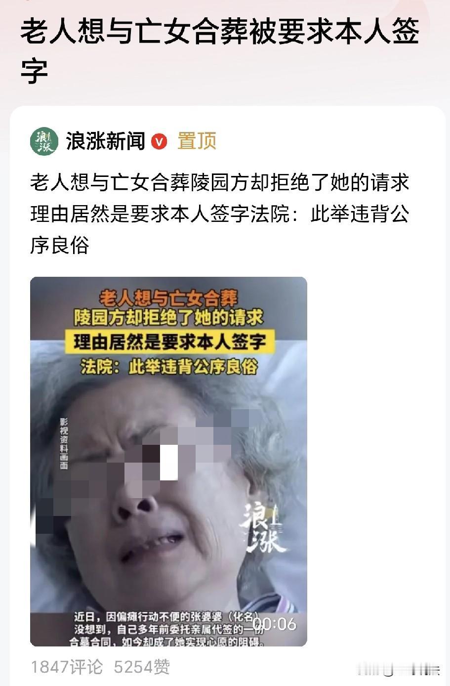 “我就是要和女儿合葬!”湖北武汉,一老人独生女去世,她悲痛万分,无力给女儿办理后事,老人委托亲戚买了一座合墓,将来她要和女儿埋到一起,谁知几年以后,老人感觉大限将至,想提前办理合墓使用权确认,万万没有想到,陵园拒绝,理由是购买合同上不是她本人签字,可亲戚不愿出面,女子拿出转账记录,说明当年代签原因,可陵园不听,拒绝老人使用合墓,老人告上法院,结果令人拍手称快! 张女士这一辈子,只生了女儿一个孩子,从小到大,女儿都是她唯一的希望。 母女俩相依为命,张女士以为,日子就会这样长久下去,将来等她老了,女儿也会守在她的身旁。 可是万万没有想到,天有不测风云,女儿年纪轻轻,竟然患上了一场大病。 这病压根就治疗不好,没过多久,女儿就在恋恋不舍中去世。 家里留下张女士一人,她肝肠寸断,接受不了失去女儿的事实。 亲戚们赶来帮助,一看张女士已经恍恍惚惚,她从上到下,满满的伤痛,根本无力给女儿操办后事。 张女士痛苦之余,委托一位亲戚帮忙去陵园购买墓地。 她要求购买一座双人合墓,等她百年,她要和女儿埋在一起。 亲戚们懂她的心意,在张女士心里,今生已经和女儿永别,可是如果她们母女合葬,将来就能在地下相聚。 亲戚立刻行动,来到墓地就说明了情况,亲戚和陵园签了合同,张女士亲自给陵园转账了过去。 手续办完,亲戚在上面签了名字,之后亲戚回来,把合同给了张女士保存。 女儿顺利下葬,张女士痛哭流涕,可是逝者已逝,女儿也希望她能好好生活下去。 转眼之间,多年过去,张女士的身体也一日不如一日,她年事已高,一边身子已经瘫痪。 张女士行动不便,她感觉自己大概时日有限,不如趁她还活着,早一点到陵园确认合葬手续。 于是她一路艰难的来到陵园,她拿出当年购买合墓的合同,要和工作人员确认一下合墓的使用权。 张女士以为,一旦确认,自己再也没有后顾之忧,等到自己百年之后,就可以安然和女儿合葬在一起。 可希望有多大,失望就有多么伤心,墓园工作人员拿起合同,却说合同上不是张女士的签字,因此张女士没有使用合墓的权利。 张女士万分悲痛,没想到自己当年没有亲自办理,竟然留下这样严重的后果。 她立刻拿出转账记录,向工作人员说明了当年购买时的情况。 可是好说歹说,工作人员都不同意,他们表示,坚决要按章办事,必须当年签字的那位亲戚前来提供材料,这样才能办理确认手续。 张女士又联系到了亲戚,可是这许多年来,家庭发生了许多的事情,因为一些变故,亲戚不愿意配合张女士办理变更手续。 张女士大哭不止,她抚住女儿的墓碑,一时之间,悲从心起。 她今生所愿,就是和女儿以另一种方式相聚,明明早已经做好了安排,可到如今,陵园却不肯让她使用。 张女士万般无奈,一纸诉状将陵园告到法院, 张女士拿出当年办理的墓地使用合同,并拿出当年的转账记录,要求法院确认自己拥有该合墓的使用权。 但陵园依旧认为,张女士不是合同签字人,因此她没有墓地使用权。 墓园仍坚持要求原经办人提供相应材料才能办理合墓使用权的确认手续。 有人认为,这大概是陵园为了避责,那位合同签约人既然不愿出面办理合葬,若陵园如果单方操作,事后难免那人会跳出来整事。 但是明明是张女士亲自转账的,谁买的就是谁的,有什么不可以确认的那? 母女同葬就象母女同住一间房,亲情难舍,阻挡母女同住的才是违背了公德良俗。 《民法典》第162条规定:代理人在代理权限内以被代理人名义实施的民事法律行为,对被代理人发生效力。 张女士因丧女之痛委托亲属帮忙购买合墓并支付了全部款项。 亲戚作为代理人,以张女士名义签约,法律效果应归于张女士本人。 陵园以非本人签字不承认合同效力,实质上否定代理制度的法律规定。 《民法典》第497条:格式条款不合理地限制对方主要权利的无效。 陵园所谓非本人签字无使用权,需原经办人办理变更的规定,属于未协商的格式条款。 张女士作为实际出资人和使用人,陵园以形式问题否定其使用权,加重消费者责任。 因此法院认定,该条款属于无效条款。 《民法典》第153条:违背公序良俗的民事法律行为无效。 母女合葬是张女士的诉求,也是她和女儿血缘情感的体现。 陵园机械的的执行内部规定,拒绝母亲与独生女合葬,割裂了母女之间的情感链接。 因此法院认为,张女士在女儿去世时委托亲戚帮忙代签合同,是张女士的真实意愿。 张女士作为女儿的母亲,本身就是该合同的实质权利人。 陵园以其应该按章办事,以墓园内部规则为由,限制张女士的相关权利,违背公序良俗,违背了张女士在购买合墓时,要与女儿合葬的初衷意愿。 法院判决,张女士享她和女儿合墓的使用权。 之后陵园表示,因张女士行动不便,陵园上门为她办理合墓使用手续。 对此,你怎么看? 关注@王哥说法 多学法律少吃亏!