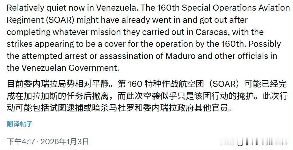 有消息称,美军成功暗杀了委内瑞拉国防部长弗拉基米尔·帕德里诺·洛佩斯。 但愿这是假消,这位国防部长11月27日才和我们驻委内瑞拉大使见过面。 此外,委内瑞拉反对派媒体报道称,委内瑞拉内政部长迪奥斯达多·卡韦略也被美军炸死。 以上消息现在还没完全证实,美军和委内瑞拉官方也没有对此发表任何说明。 委内瑞拉总统马杜罗已下令在全国范围内大规模动员所有准军事力量,以对抗美国的入侵。 目前委内瑞拉首都已恢复了安静。 最不可思议的是进入委内瑞拉首都上空的美军那堆空突直升机不见踪影,是返回了,还是降落了,没人知道,总之失踪了?委内瑞拉战局