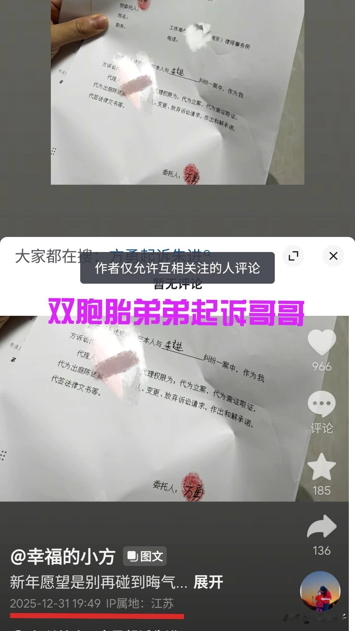 你认为亲情要比💰重要吗[思考]? 南京认亲的双胞胎弟弟,居然要起诉他哥哥了[震惊]!他曾因担忧被分家产,果断将哥哥逼走。现在看哥哥带货赚钱,又急得跳脚,真是挺讽刺的[笑哭]。 这双胞胎父母也是绝,当年抛弃大儿子不去愧疚,又纵容自己小儿子,在网上算计大儿子[what]?弟弟改了网名叫“幸福小方”,跨年夜当天晚上,在账号晒起诉书吐槽,却不敢打开自己评论区[思考]。 他既恐怕哥哥夺家产,又想蹭哥哥的流量,真是好笑又可气[酷拽]。本来全家能体面的带货,却因弟弟作妖付之东流。这件事你咋看?评论区说下你的看法吧。 免责声明:本文素材来源于网络,旨在传播正向价值。若有疑问,请联系本人处理。