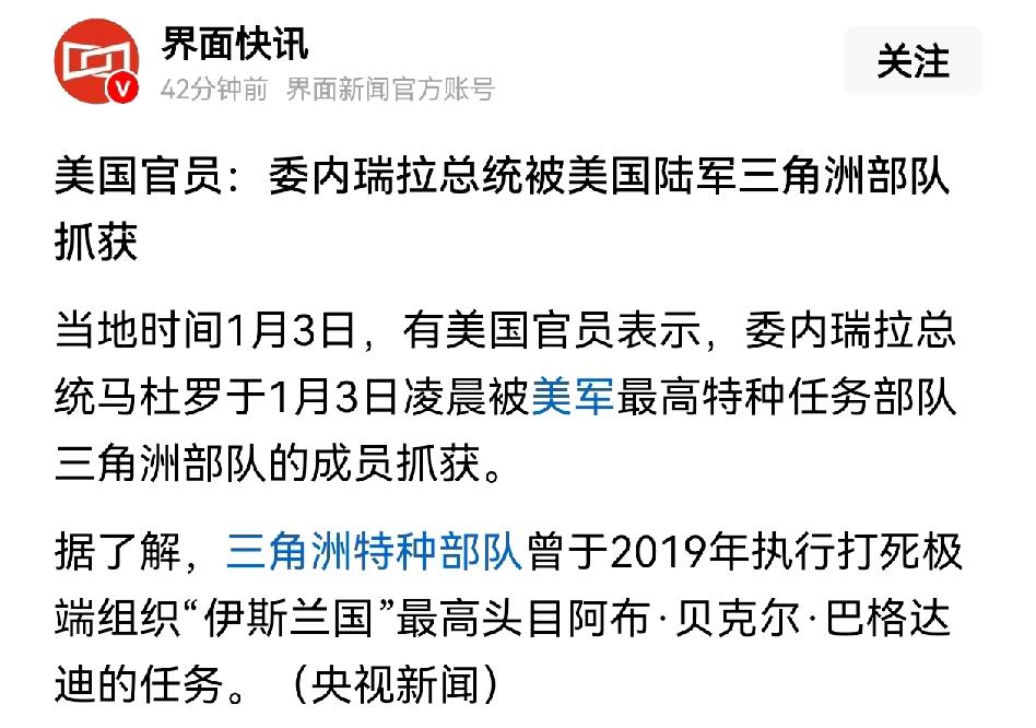 委内瑞拉总统马杜罗被美军最高特种任务部队三角洲特种部队成员抓获,并已经送往美国,这绝对是2026年开年黑天鹅事件。仅仅是一次小范围行动,就被美国精准“清除”了。 吃惊之余我们不禁感叹,委内瑞拉到底外强中干到什么地步了。一个国家的总统,竟然在睡梦中被其他国家特种部队抓获了。委内瑞拉的安保何在?委内瑞拉军队哪里去了?马杜罗的民心何在呢? 这就是现实,没有坚守到底的抵抗,没有委内瑞拉人民的同仇敌忾,有的只是树倒猢狲散,让人唏嘘的、出乎意料的结局。目前马杜罗生死未明,按照特朗普的说法马杜罗要在美国接受审判,不知道现在的马杜罗作何感想。