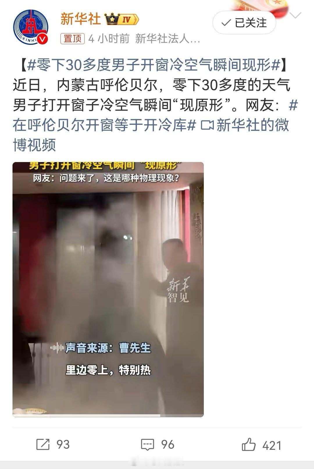 零下30多度男子开窗冷空气瞬间现形 极寒地区就是这样的情况。屋里面20多度,屋外面零下三十多度。一开窗或者一开门就有这种冷热碰撞的画面。反正就是挺神奇的,但这种极寒和极热的环境,我出差一礼拜就表示受不了 佛山