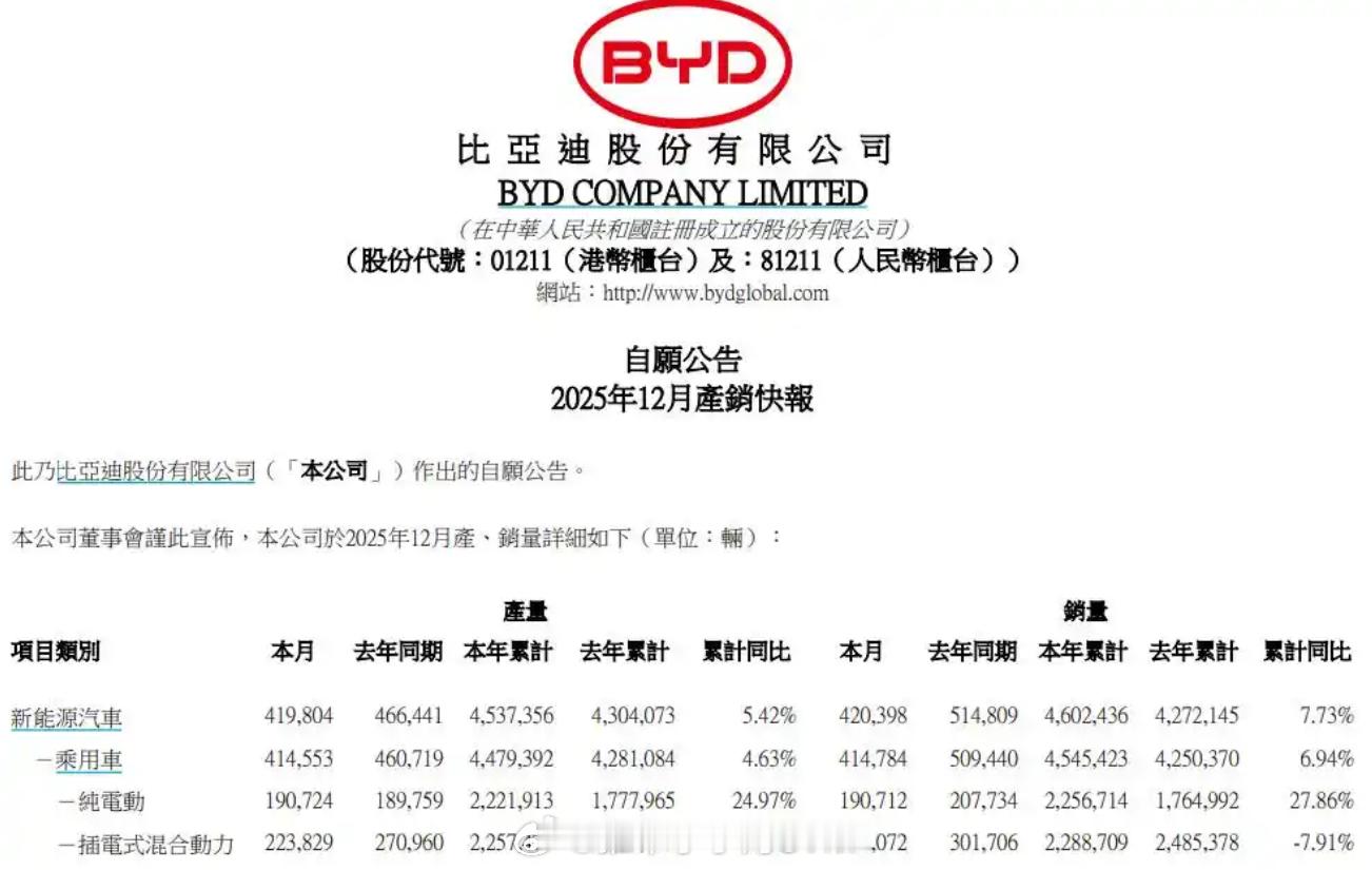 比亚迪销量超特斯拉成第一比亚迪成为全球最大纯电动车制造商 比亚迪销量早就超越特斯拉了。现在是纯电动销量也超越特斯拉,这回不会再说比亚迪靠插混之类的话了吧?比亚迪2025年总体新车销量超460万辆,同比增长约8%,其纯电动汽车新车销量超225万辆,同比增长约28%。特斯拉2025年全球交付汽车163.6万辆,同比下降约8.6%。这是特斯拉有史以来首次在全年电动汽车销量上被比亚迪超越。而且在海外市场,比亚迪还在疯狂上涨,2025年,比亚迪全年海外销量超过104万辆,要知道,2024年比亚迪海外销量才41.72万辆,这个涨幅有点可怕。2025年1-11月,比亚迪在英国、德国、意大利、西班牙、奥地利、爱尔兰、马来西亚、土耳其、新加坡、泰国、中国等11个汽车核心国家市场,销量已经全面超越特斯拉。2024年的时候,特斯拉还以2万辆的优势险胜比亚迪,2025年,就被大规模反超。好戏看来还在后头呢。中国汽车年出口量将再创新高