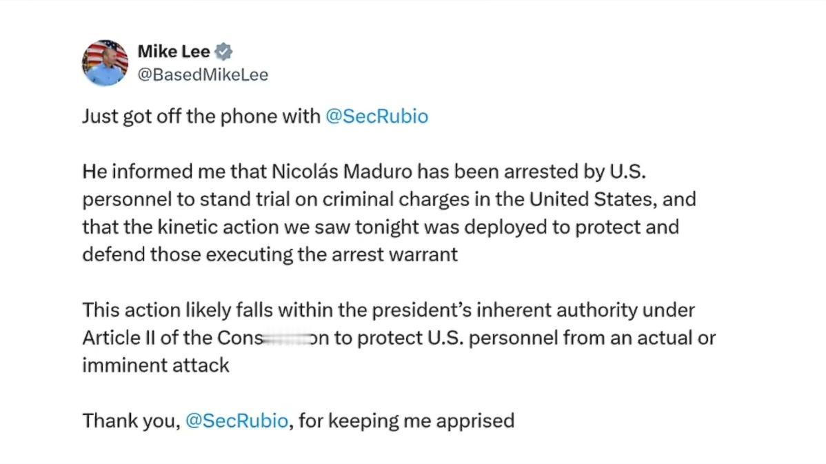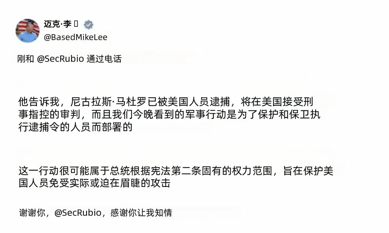看委内瑞拉总统府米拉弗洛雷斯宫04:52分的情况,这像是有人攻击过这里吗?这里很安静和整洁,没有看到一丝破坏! 哥伦比亚特派记者Leonel Retamar在委内瑞拉首都加拉加斯总统府时,发出此灵魂一问。哥伦比亚时间03:52分(委内瑞拉加拉加斯时间04:52分),总统府现场图像会让人误解有人曾对米拉弗洛雷斯发动过攻击。事情才发生两个小时前。 你说是委内瑞拉有人把马杜罗绑了交给美方,我也敢信。感觉双方下场打了场假赛的感觉:你把人交给我,我就不地面侵略你了。 要是抓的马杜罗是个替身,那就更好笑了! 美国犹他州共和党籍参议员迈克·李称,鲁比奥给他打电话了,马杜罗将在美国接受审判。