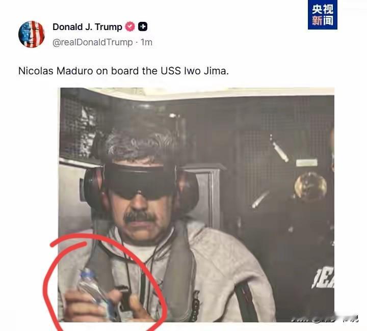 不甘,马杜罗被抓后把瓶子都捏扁了 特朗普通过社交平台放出了马杜罗被抓捕之后的照片,在照片中马杜罗戴着眼罩,手部戴着手铐,手里拿着矿泉水瓶子,而瓶子已经被马杜罗捏扁。 可能马杜罗是心有不甘把气都撒在了手里的瓶子上,也有可能是马杜罗害怕了用力的握紧瓶子。 从此可以看出马杜罗是真的非常不甘。