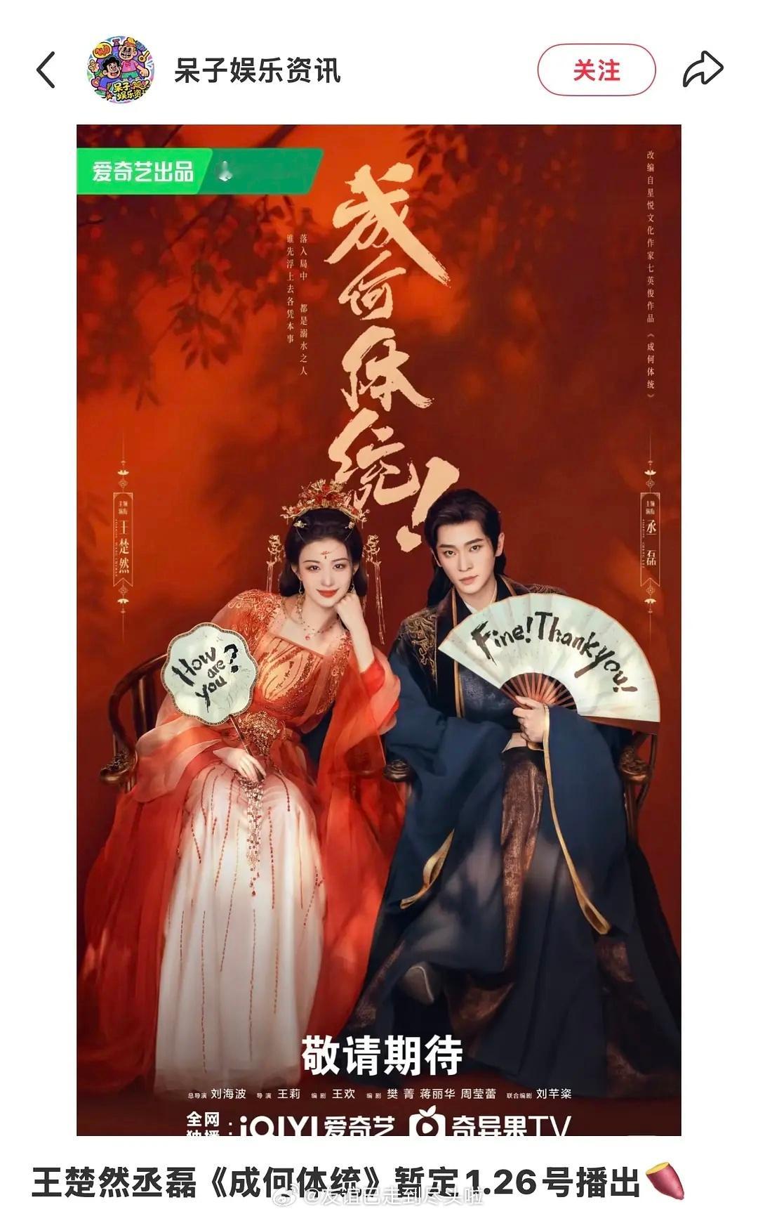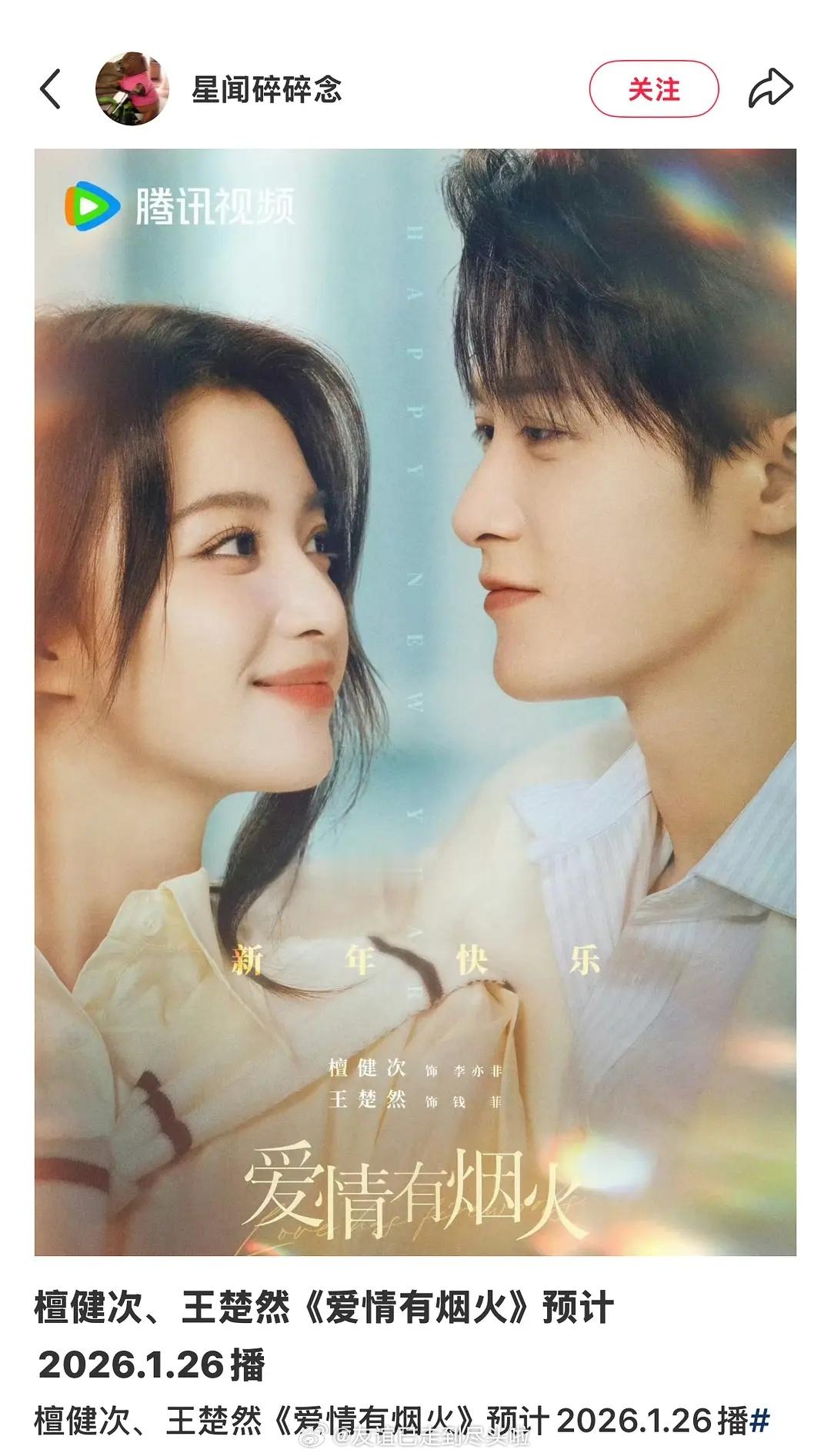 王楚然丞磊《成何体统》,檀健次王楚然《爱情有烟火》都在传1月26日播出,王楚然两部新剧要同档期对打了。