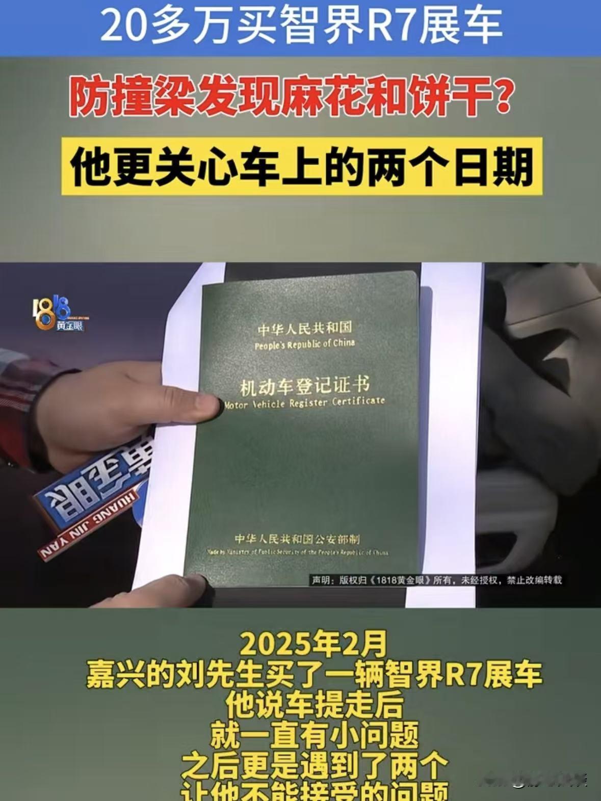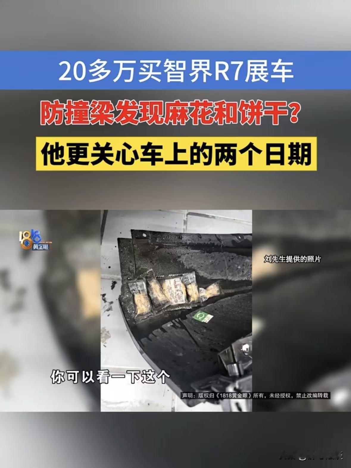 浙江嘉兴,男子买了一辆智界R7展车,花了289800元,万万没想到,车刚开了4个月的时间,却时不时的有点小毛病,经查,在车辆的防撞梁夹层里掏出了不少麻花和饼干,男子不干了,找到4s店讨要说法,谁知对方直接说是老鼠干的,在没有其他的解释,转眼又过去6个月,上一个问题还没有解决,男子又发现了新问题,车上面的检验合格日期和车辆登记证书上的日期相差1年零8个月,男子气急,再次找到4s店讨要说法,谁知对方的处理态度,更是让他火上浇油! 刘先生一直想买辆空间大、性能好的SUV,对比了不少车型后,最终看中了智界R7。 当时4S店销售说有一辆展车在售,车况绝对没问题,就是在展厅里摆过一段时间。 而且车上显示的公里数也符合相关标准,里外都保养的很好。 刘先生想着展车无非是让人看看,又没开过,而且这辆车的配置确实戳中了他的心巴上。 不管是家用还是通勤都合适,加上信任品牌口碑,就没多犹豫。 2025年2月16日,刘先生当场交了289800元把这辆展车提回了家。 合同上面明确写着这辆车属于展车销售,以及对于车辆展示痕迹以及车联网使用状态。 刚提车那阵子,刘先生还挺满意,车子开着顺畅,内饰也没看出啥磨损,心里还暗自庆幸捡了个准新车。 可好景不长,才开了4个月,车子就开始闹脾气。 不是这有点问题就是那优先小毛病,要不就是有异响。 直到2025年6月20日,刘先生驾车出了点摩擦,需要维修。 万万没想到。在检查定损的时候,维修师傅把车辆保险杠拆开后。 在防撞梁的夹层里,掏出了不少零食,有碎掉的麻花,还有几块受潮变软的饼干,零零散散堆在里面。 刘先生当时就懵了,这防撞梁可是车辆安全结构的重要部分,密封得严严实实的,怎么会藏着这些吃的。 而且他仔细看了看,这些零食都是在店内给客户准备的那种小点心,自己根本没往车里带过这类东西。 刘先生拿着证据找到4S店讨要说法,谁知道工作人员一听,张口就甩了个理由: 这肯定是老鼠干的,估计是老鼠钻进车里把零食拖进去了。 这话一出,给刘先生都气笑了,老鼠干的?那老鼠屎、老鼠尿在哪呢? 车里里外外都干干净净的,连点老鼠活动的痕迹都没有,怎么就偏偏把麻花饼干拖到防撞梁夹层里? 他让工作人员给个合理的解释,可对方既不打算深入检查,也不提解决方案,就这么把刘先生晾在一边。 就这样一晃又过了半年,同年12月份,刘先生意外发现,车辆登记证书上的制造年月是2024年9月。 可右后座椅背面的检验合格标签上,日期赫然写着2025年1月12日。 刘先生无法理解,24年的车怎么会装上25年的配件,南到车座椅被换过? 这一下刘先生彻底坐不住了,花近30万买的车,先是防撞梁里藏零食。 现在又出现日期不符的大问题,这已经不是小毛病了,而是关系到车辆是否被动过手脚、是否存在安全隐患的大事。 他再次火急火燎地赶到4S店,要求对方给出合理解释: 座椅到底有没有换过、为什么检验日期和登记日期差这么久、车辆还有没有其他没告知的问题? 谁也没想到,这次4S店的态度更让刘先生无法接受。 工作人员毫无歉意,反倒拿“展车现况销售、已签告知书”当理由。 完全无视他提出的防撞梁有零食、座椅及日期异常的质疑,要么敷衍要么回避。 更离谱的是,当初的销售门店已换了品牌,新工作人员直接将他拒之门外。 刘先生联系原销售和门店负责人,始终无人回应,他连续22天致电智界官方客服,对方每次都说有专人对接,却从未有人主动联系。 后来记者介入,联系客服询问时,客服更是直接表示没有接待媒体的权限,态度十分强硬。 刘先生现在是骑虎难下,车已经开了快一年,退也退不了,修也没个明确说法,心里始终悬着一块石头。 他就想不明白,自己花真金白银买的车,就算是展车,4S店也该如实告知车辆的真实情况,做好售前检查。 《消费者权益保护法》第20条:经营者向消费者提供商品信息应真实、全面,不得作虚假或引人误解的宣传,不能以“现况销售”推卸主动披露义务。 刘先生有权知道该车辆的使用情况,维修记录等重要情况。 展车的非全新属性和可能存在的问题,销售方都有主动披露的义务,不能一句现况销售就把所有责任都推掉。 其实懂行的都知道,车辆的防撞梁本是保障行车安全的关键部件,如今夹层藏有零食,其受力性能是否受影响存疑。 检验与登记日期相差过久,更可能涉及零部件更换未告知,进而影响车辆合法上路和后续理赔。 之前也有类似事件发生,经销商隐瞒展车属性或车辆问题,被法院判决赔偿,严重者还需承担退一赔三的欺诈责任。 现如今刘先生已收集好相关证据,准备向市场相关部门投诉,必要时通过法律途径维权。 他希望4S店能正视问题,给个明确说法,而不是一直逃避推诿。 对此,你怎么看这件事? @静心法谈 学法辨是非,慬法不吃亏。