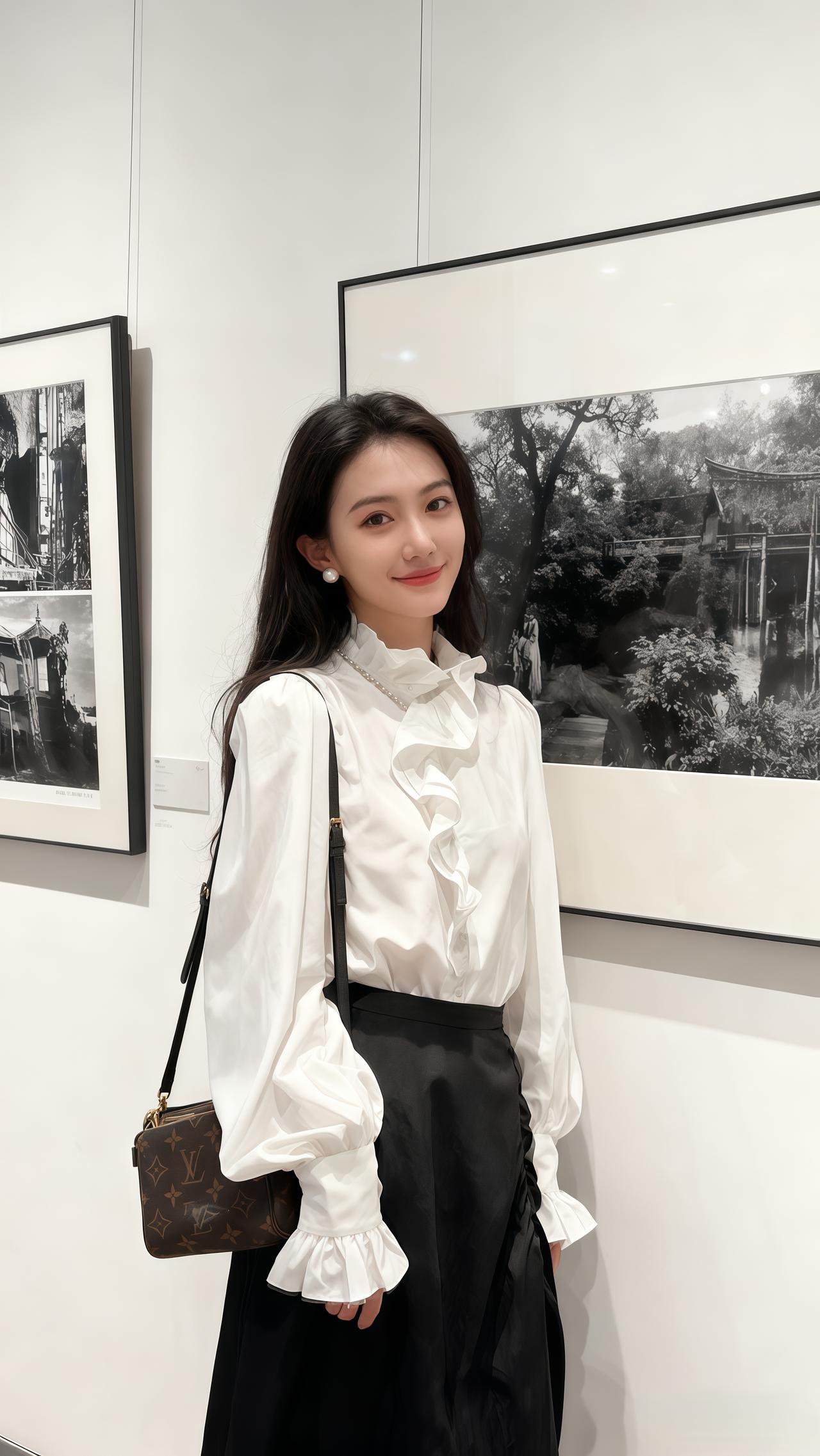 黑色西装裙很显干练,搭配浅色包包和高跟鞋,简约又有气场,这样的穿搭很适合通勤~