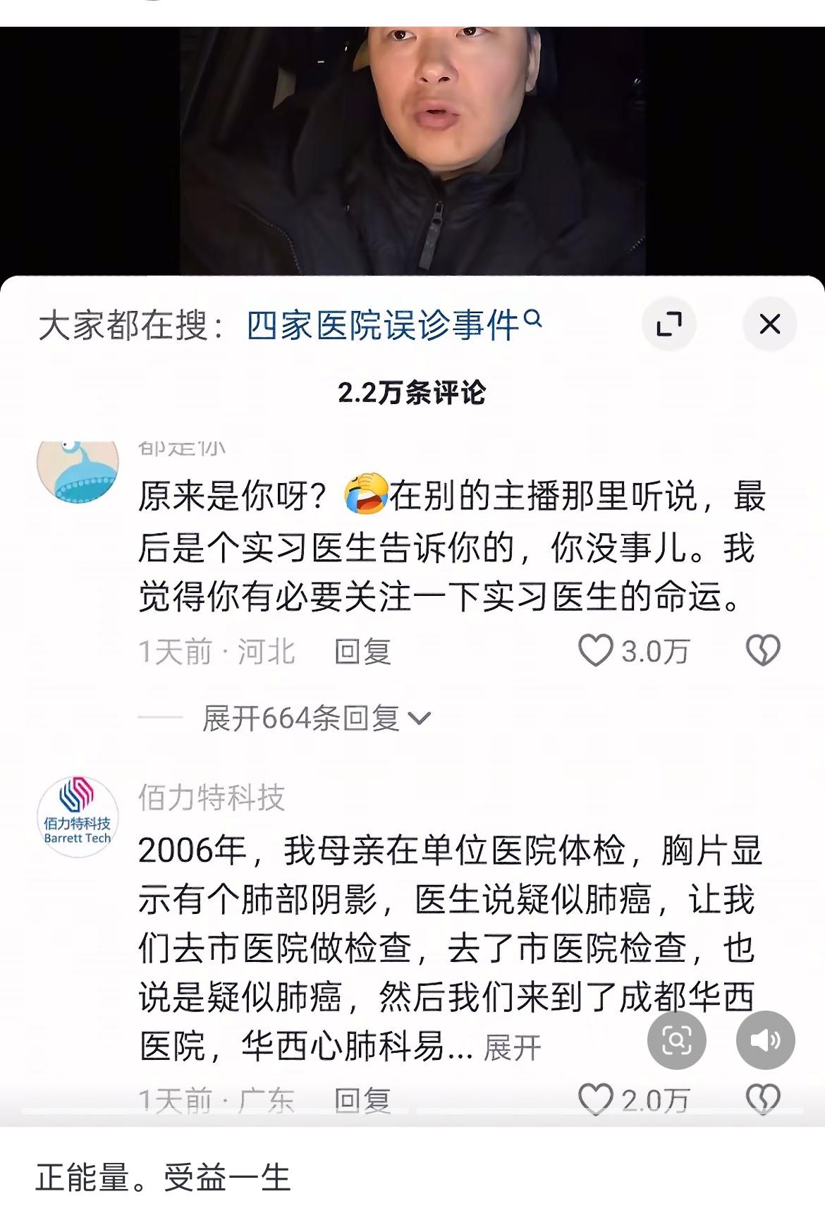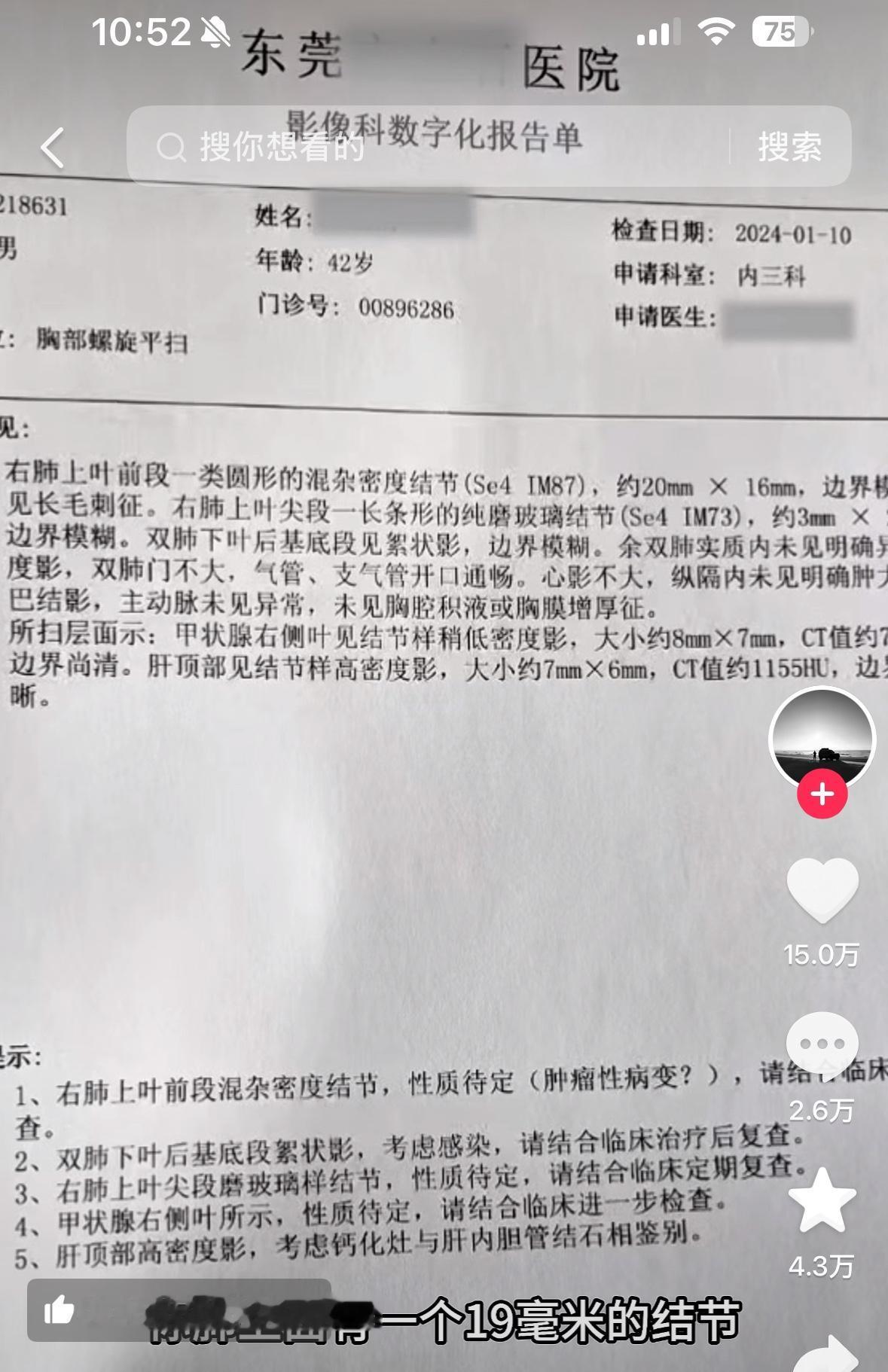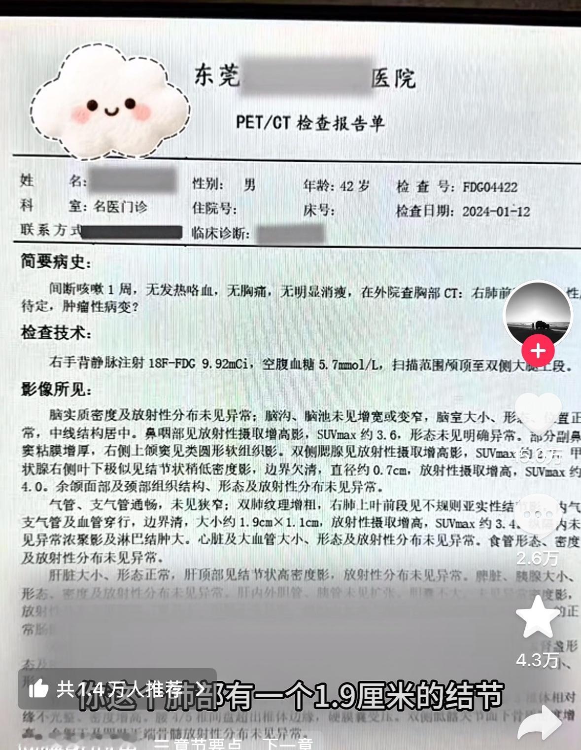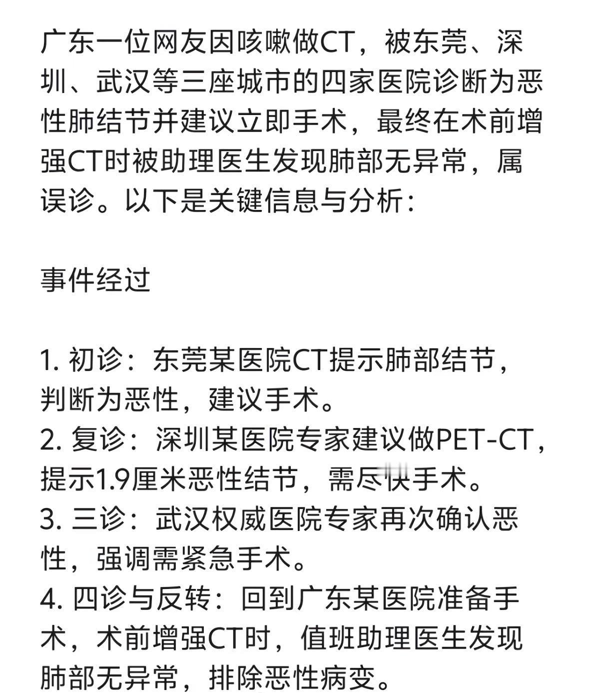 一名42岁东莞男子,被4家三甲医院确诊肺癌,却在做手术前发现误诊。网名叫睡醒的鱼的男子,发视频自曝说在上手术台前,做最后一次增强CT,被医院的实习医生发现搞错了误诊,其肺部没有问题,这才免于一刀。 因为长期咳嗽,日咳夜咳,让这名男子苦不堪言,于是去医院检查。2024年1月10日,第一家去的是自己所在地的东莞某三甲医院,CT检查显示肺部有阴影,怀疑是恶性肺结节,如不干预将发展成肺癌。 本着求真务实的本能,又跑了深圳一家医院,检查结果差不多,也被认定恶性肺结节,需要马上手术。 还是不死心,跑到武汉某权威肿瘤医院,检查依然还是这个情况,男子已经决定做手术。 考虑到武汉、深圳离家远,做手术不方便家属照顾,于是又跑回东莞某医院,手术准备都做的差不多了,为了更好的做手术,再做一次增强CT,把它作为做手术的参考。CT影像资料却被一名实习医生发现端倪,肺部没有异常,也就是说肺部没有肺结节,之前是被误诊了。 专业医生对此进行了分析,说是肺部结节是因为感冒之类的感染生成,但是随着病情好转肺结节也消失了,并不是恶性肺结节,是肺癌,需要手术。这要是上了手术台,就真的说不清楚了。所以得了大病,还是要多跑几家医院。