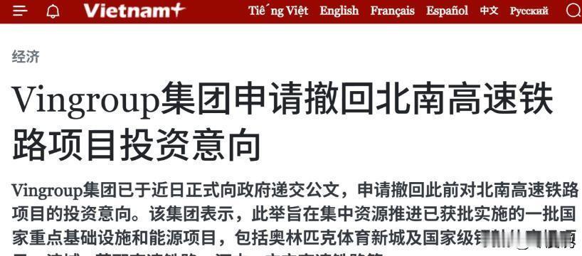 南北高铁搁浅?越南首富退出,这么大的项目谁来接盘? 越南南北高铁项目最近又闹大新闻。6月初,越南最大民企温纳集团宣布退出,总投资预计高达670亿美元的高铁建设,彻底放弃投标。这让外界一片哗然,毕竟前一周他们还刚和德国西门子签协议、要搞高铁合作,被认为是最有诚意的竞标者。 但现实太骨感:温纳集团提的融资方案是自己掏20%,剩下80%全由政府零利率贷款解决,还得拖到35年后再还。结果财政部和央行都觉得风险太大,直接否了。 其他竞标的两家越南企业同样没拿出靠谱方案,一家只愿做配套建设,一家连资金实力证明都没法给。企业怕亏本,政府没钱兜底,还出于政治敏感不想交给外国人。这么一来,南北高铁就陷入了卡壳状态。 说到底,越南企业精打细算,票价一算根本比不过航空业,没人敢赌这么大。政府又看重长远发展,但囊中羞涩。一拍即合变成一拍两散,高铁“世纪工程”怎么办?如果融资难题解不开,只能继续搁着,空留期待。这结局,只能说不令人意外。
