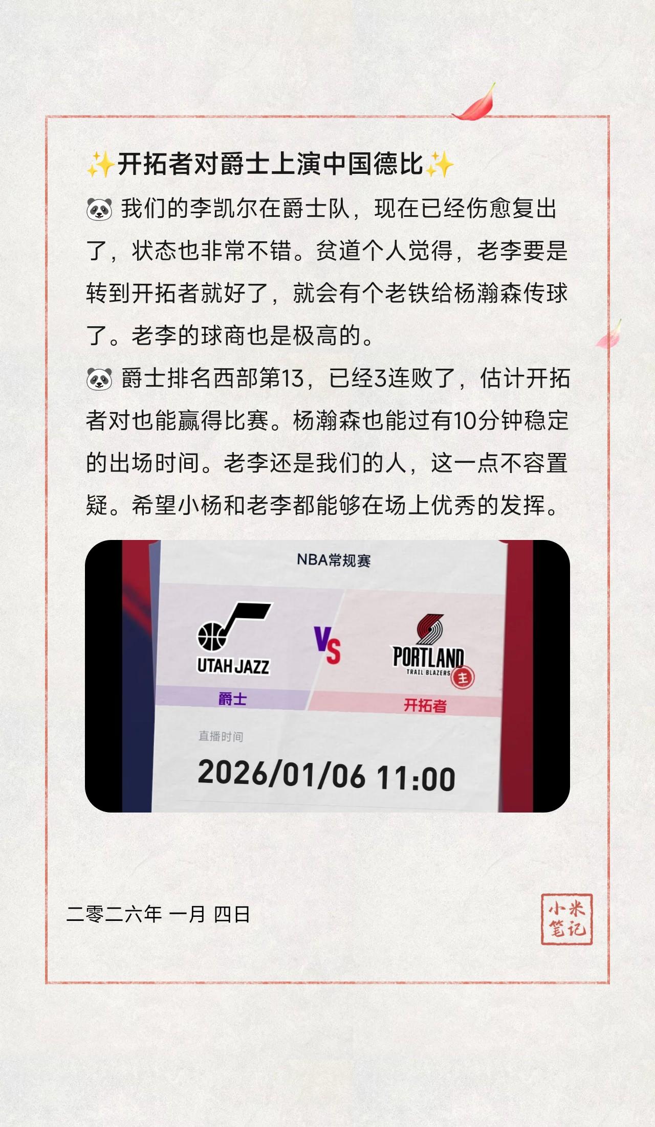 🐼 我们的李凯尔在爵士队,现在已经伤愈复出了,状态也非常不错。贫道个人觉得,老李要是转到开拓者就好了,就会有个老铁给杨瀚森传球了。老李的球商也是极高的。 🐼 爵士排名西部第13,已经3连败了,估计开拓者对也能赢得比赛。杨瀚森也能过有10分钟稳定的出场时间。老李还是我们的人,这一点不容置疑。希望小杨和老李都能够在场上优秀的发挥。 ——这场中国德比不容错过啊! 作者:龙须面🧐