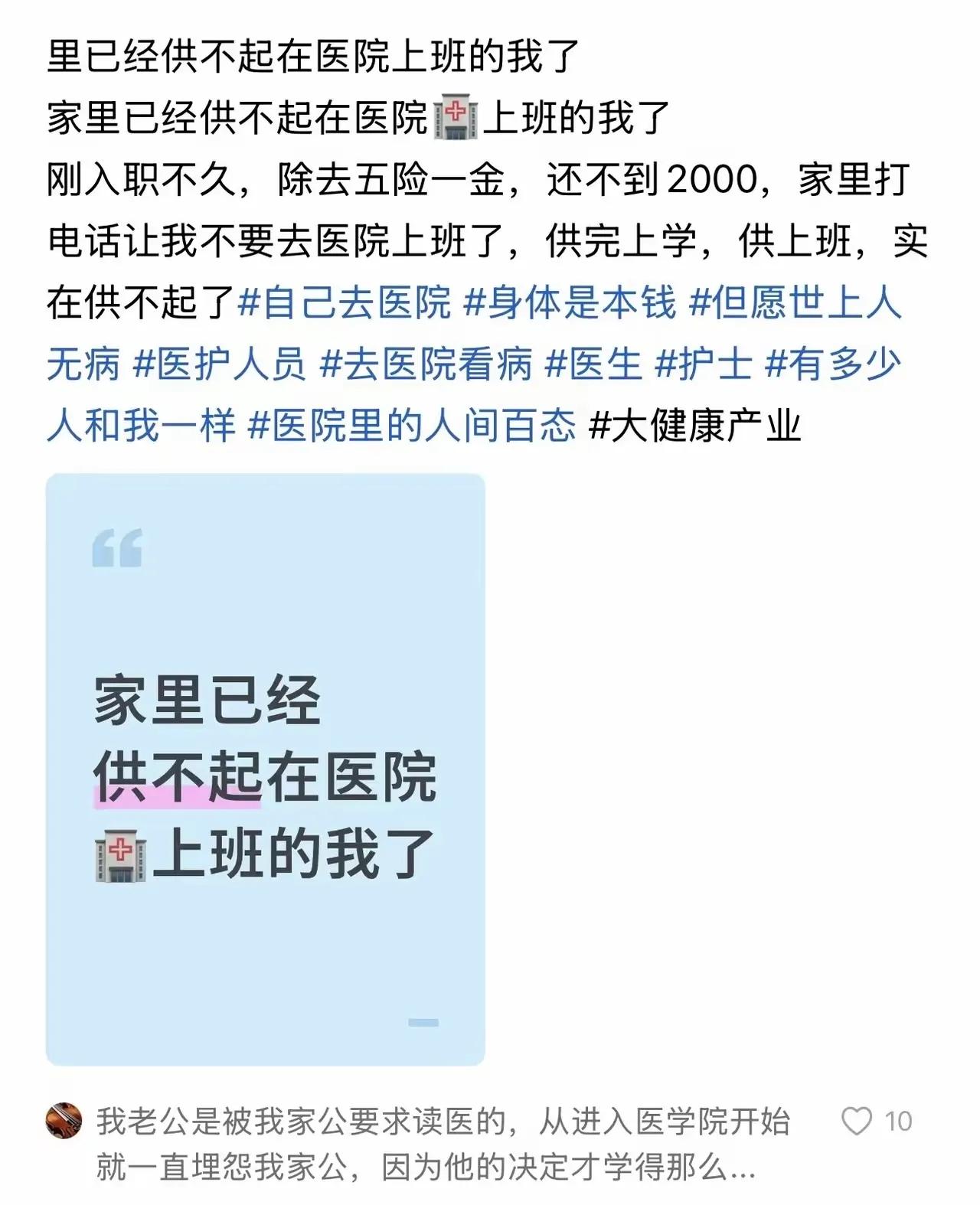 这位毕业生入职的究竟是一家什么样的医院?每个月的工资到手扣除五险一金后,还不到2000块钱,这年头,这点钱让人怎么活? 难怪他的家里面已经给他打电话,让她不要再去这家医院上班了,因为去这家医院继续上班,家里面还要每个月倒贴钱给他,他才能勉强生活的下来,家里已经供他从小学读到了大学毕业,现在还要出钱供他上班,哪有这样的道理? 由于他在帖子当中没有说明具体是个什么样性质的医院,所以我猜测大概就是那些位于偏远地方乡镇上的民营医院,否则,其他医院的话绝对不会开这么低的工资。如此低的工资,工作地点又是在偏远乡镇,这样的工作真的没有任何意义。早走早翻身,及时止损才是上策。