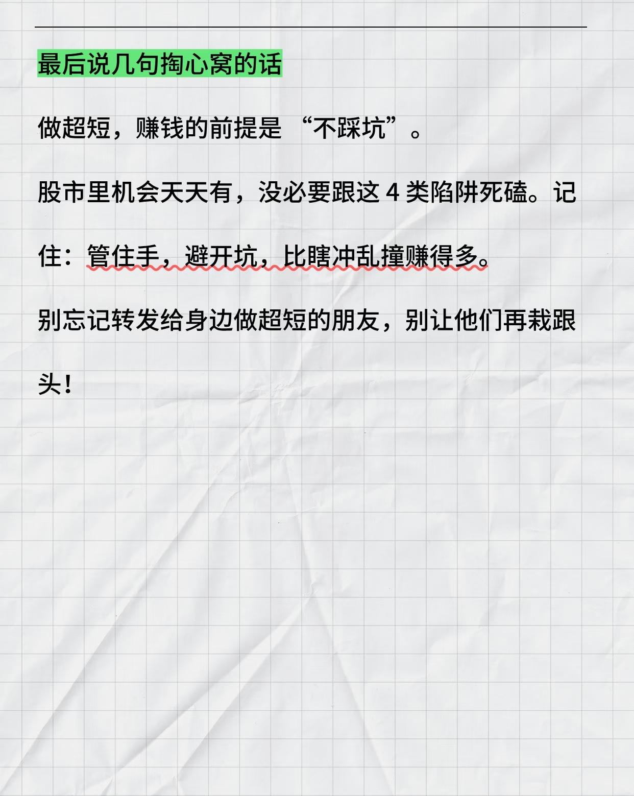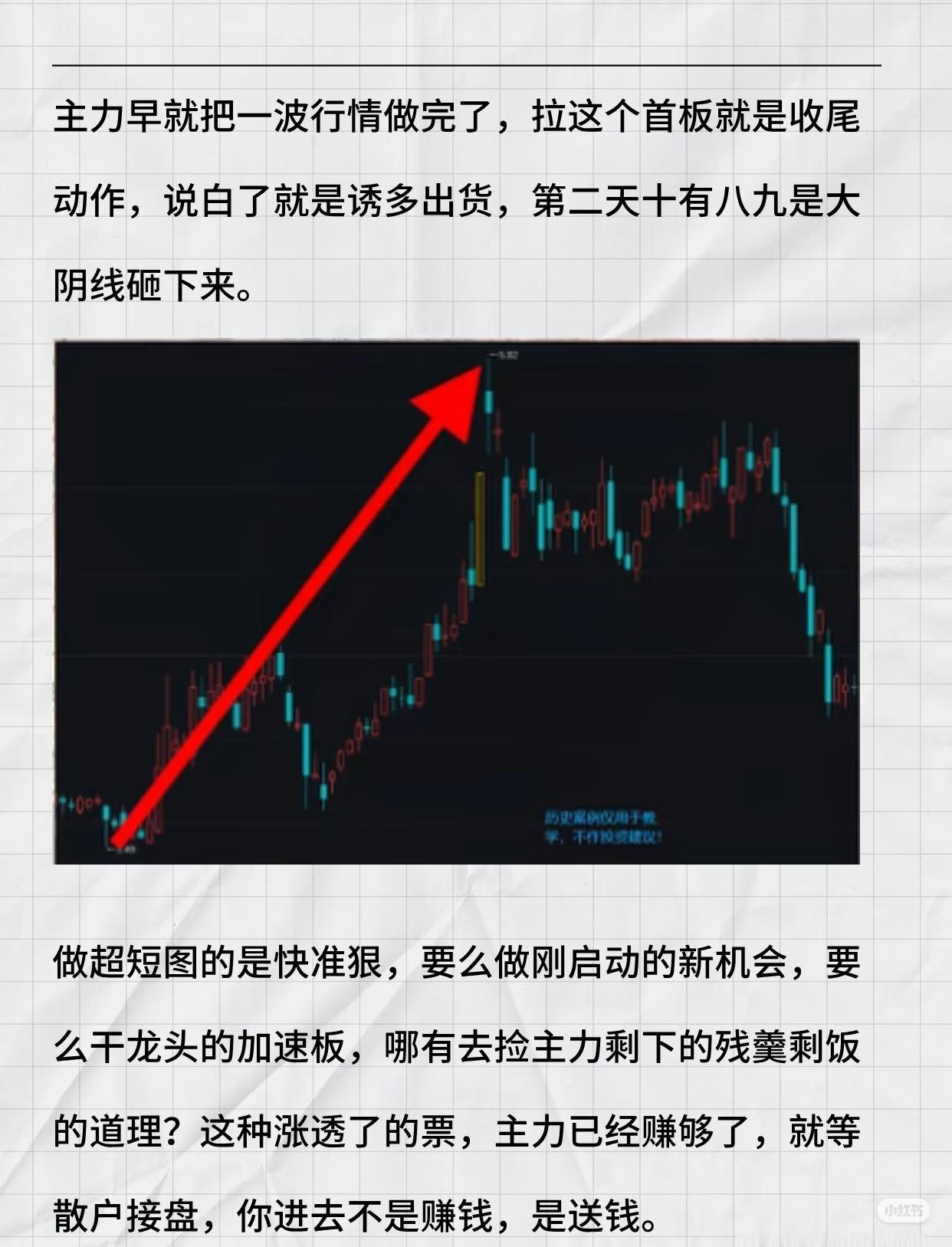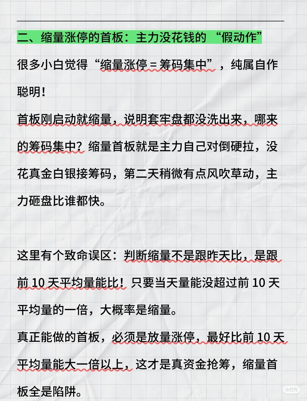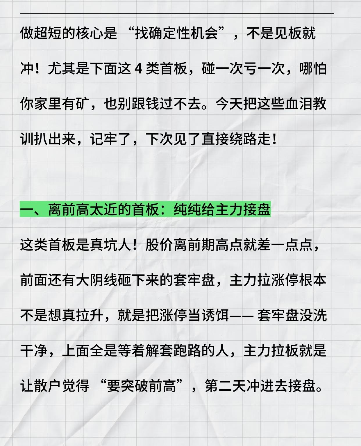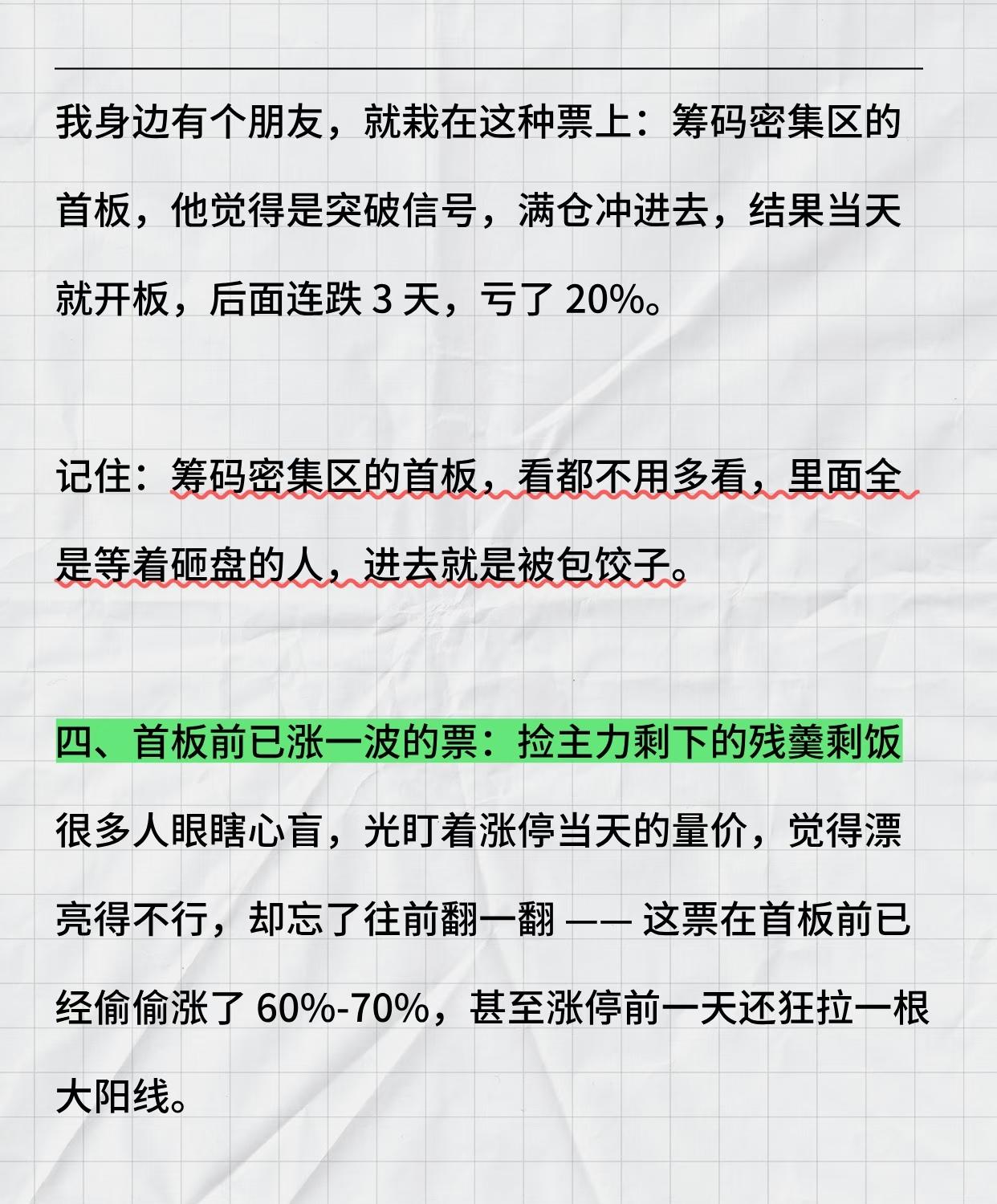 一位有10年超短线投资经验的“老炮”分享经验:靠避开4类首板,将超短胜率提升至80%,并强调这4类首板是“家里有矿也别碰的坑”。 需避开的4类首板及原因: 1. 离前高太近的首板:股价离前期高点仅差一点,且存在大阴线套牢盘,主力拉涨停是诱饵,让散户误以为要突破前高,次日接盘。案例:朋友因某股离前高差3个点拉首板,次日买入后被套牢盘砸盘,亏15%才割肉。 2. 缩量涨停的首板:小白常误将“缩量”等同于“筹码集中”,实则首板缩量多为套牢盘未洗出,主力对倒硬拉(未真金白银接筹),次日易砸盘。正确判断:需对比前10天平均量能,未超一倍即为缩量,真正可做的是放量(超前10天平均一倍)涨停。 3. 卡在筹码密集区的首板:股价横盘一两个月形成密集套牢区,首板撞在此位置时,套牢者会趁机砸盘,游资不会费力帮解套。案例:朋友满仓买入此类首板,当天开板后连跌3天亏20%。 4. 首板前已涨一波的票:首板前已偷偷涨60%,甚至涨停前一日拉大阳线,此时首板是主力诱多出货的收尾动作,次日大概率大阴线砸盘,属于“捡主力残羹剩饭”。 最后提醒:做超短赚钱的关键是“不踩坑”,股市机会多,无需死磕这4类陷阱。核心是“管住手,避开坑”,比盲目操作更易盈利,建议转发给做超短的朋友避免亏损。