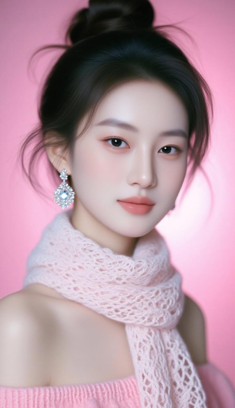 甜美少女风,粉色系穿搭,精致妆容,优雅气质。