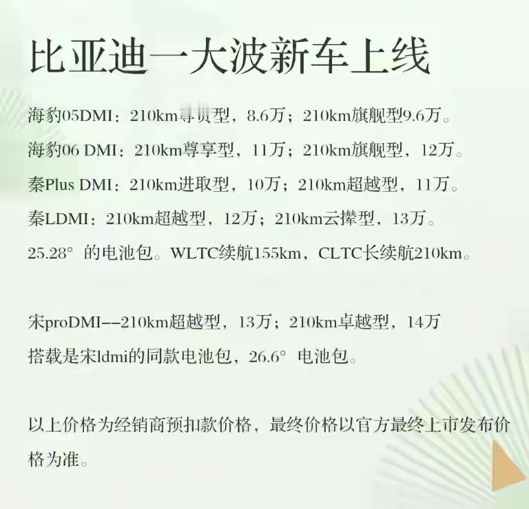 比亚迪混动放大招!纯电续航210km新车到店,8.6万起卷疯市场 混动车型的续航焦虑?比亚迪直接用大电池给出答案!近期王朝网、海洋网多款混动新车集中到店,秦L DM-i、秦PLUS DM-i等热门车型领衔,纯电续航最高飙升至210km(CLTC标准),直接看齐部分纯电车型,彻底告别“短途也得开混动”的尴尬。 新车核心升级直击痛点:全系换装超25度大容量电池,不仅纯电续航翻倍,馈电油耗也保持低水平,日常通勤完全可当纯电车开,长途自驾无续航压力。配置上更是诚意拉满,部分车型搭载最新Dilink 6.0车机系统,响应速度更快、功能更丰富,还升级了L2级驾驶辅助,提升出行安全性与便利性。 价格方面依旧亲民,预售价8.6万起,覆盖主流家用车区间,让消费者花更少的钱享受更高配置和更长续航。目前多款新车已陆续到店接受试驾预订,1月上旬将正式上市。 无论是追求低用车成本的通勤族,还是看重长途实用性的家庭用户,这批大电池混动新车都精准戳中需求。比亚迪混动新车卷疯了 你会去店里试驾体验吗?【来自懂车帝车友圈】