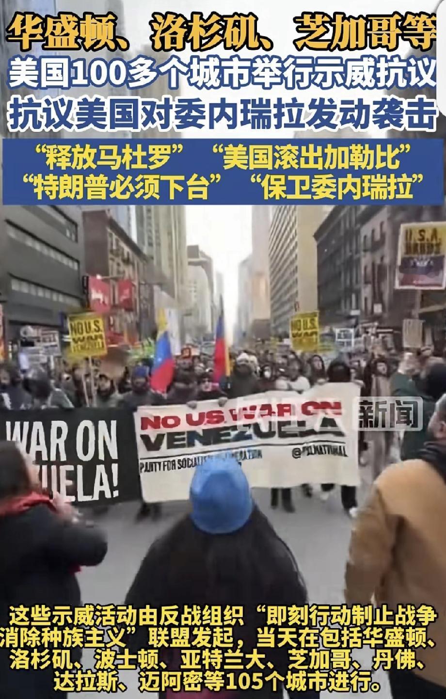 美100多个城市举行示威抗议对委行动 美国又搞事了!1月3日,美军凌晨对委内瑞拉发动大规模军事打击,抓走总统马杜罗,特朗普还宣称美国要“管理”委内瑞拉,美企将投资数十亿“维修”石油设施。这吃相太难看,司马昭之心路人皆知,就是冲着人家石油去的。 不过美国国内也不太平,“即刻行动制止战争消除种族主义”联盟发起抗议,105个城市举行示威。纽约时报广场上,示威者高举委内瑞拉国旗,喊着“美国滚出加勒比”等口号。国际上多国谴责,智利总统说“今天是委内瑞拉,明天就可能是任何一个国家”。美国这战争机器还不停,真是不得人心!