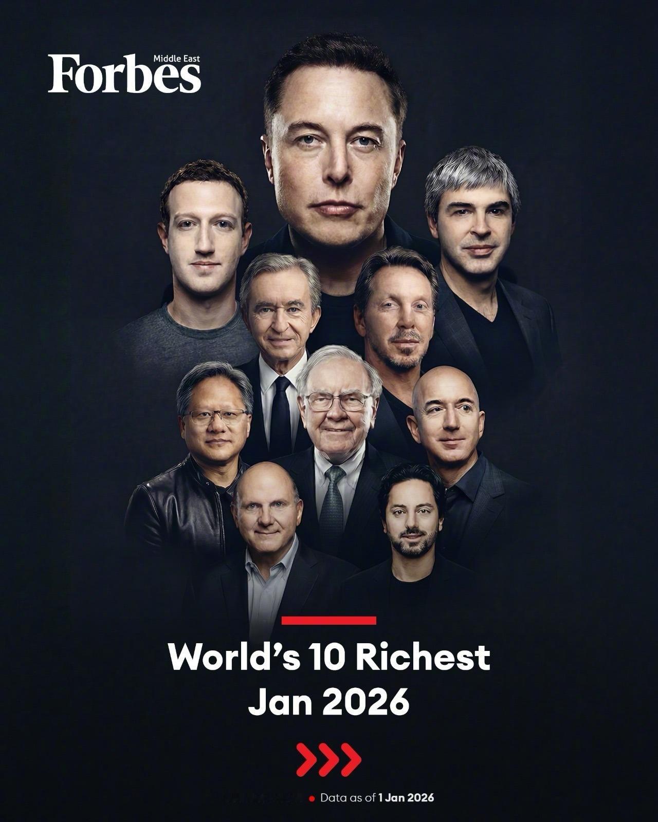 福布斯发布截至2026年1月的全球十大富豪榜:埃隆·马斯克以净资产7260亿美元排行第一,比排名第二的拉里·佩奇富有三倍。拉里·佩奇(Larry Page)是谷歌(Google)的联合创始人之一。全球两位最富有的人之间的财富差距从未如此之大。由于股市下挫,上个月前十名富豪中有六人的财富出现缩水。