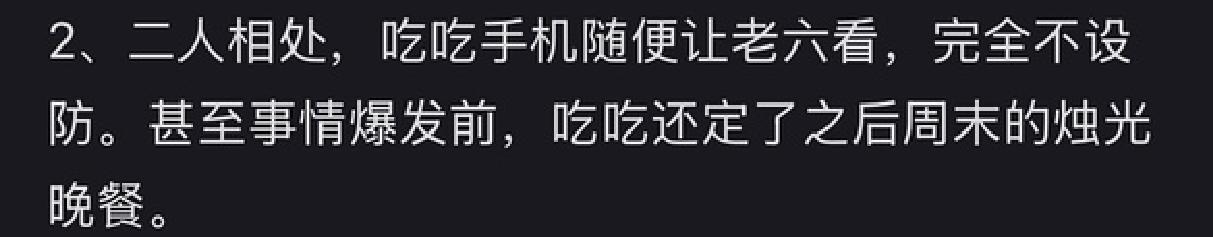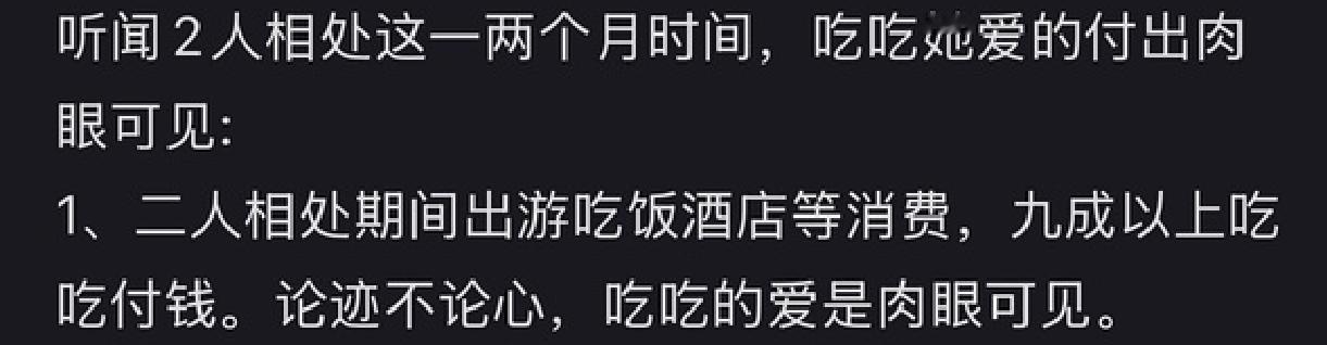 吃吃刘子晗这对,究竟是因为什么分的手,现在终于又有最新证据呢了 女方的好友在网上发文,痛斥了刘子晗在恋爱期间的表现。 第一就是花钱方面,9成以上的开销,都是女方在承担,涵盖了旅游,酒店,吃饭等费用 我觉得这一点还是挺靠谱的,刘子晗刚来上海,工作不稳定,创业也失败了,甚至出门开的车,都是吃吃的,就这个经济条件,能给女方花什么钱呢 第二,女方对男方不设防,手机都是公开的,可以随便看,我估计大部分就是女方的各种自拍照而已,相反,男方通过手机蛐蛐女方,结果被吃吃发现了 第三,刘子晗一直说什么女方物质,结果人家根本不是这样的女孩,从不希望刘子晗花什么大钱 最重要的是,和方医生相比,刘子晗都送了啥值钱的东西啊 在节目里表白的时候,送了个玩偶蛋糕,哄小朋友玩的那种 下了节目之后,值钱的就3件,一个kitty的水杯,一双拖鞋,还有配套的睡衣,一共就这些东西,加一起能有1000块吗 这些东西按照上海的消费水平,我觉得是拿不出手的 说白了,吃吃是有小女生的任性,但我不认为她一味索取,情绪黑洞,正常女性都喜欢男朋友提供情绪价值。吃吃很愿意积极沟通,自己有问题愿意迁就。问题根本在于男方只想短择,不袒露自己的需求,所以沟通是以省事为主,女生是敏感的所以才会幻得患失没有安全感。现在男方更严重的是欺骗与伤害。 刘子晗今天能跟别的男人争,他改天就能在爱情里跟你争。要选就选方医生那种,有自己的节奏感的人 吃要的是欣赏她,又在自己领域里优秀的引导型恋人,老6需要的是恋综的知名度+征服一个还可以的美女,谈一段走一步看一步的恋情,所以说从一开始就已经结束了