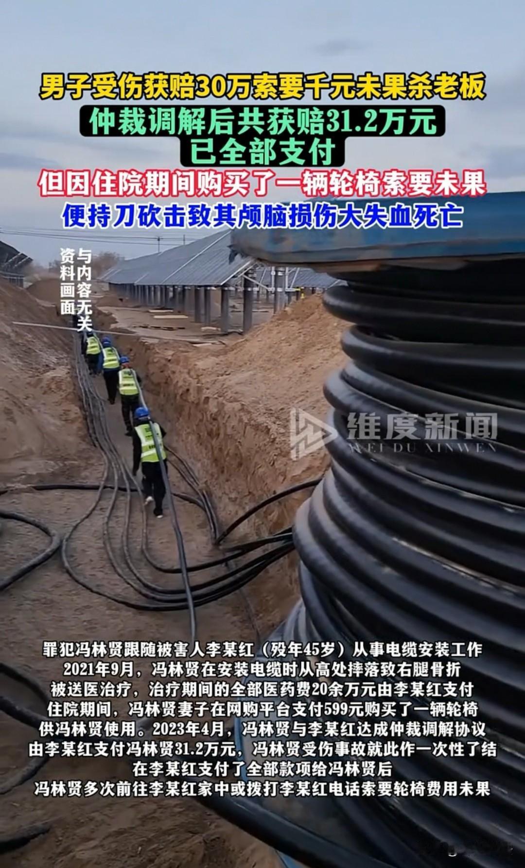 “为了1000元,竟对雇主下狠手!”江西,52岁的冯林贤工伤摔断腿,雇主不仅全额垫付20余万元医药费,还按协议赔偿31.2万元,可他却盯着妻子599元买的轮椅,执意要雇主额外支付1000元,遭拒后竟持刀上门行凶,夺走了曾全力救治他的雇主生命! 冯林贤平日里看着老实本分,干活也还算勤快,2021年9月,他受雇于李某红,跟着团队一起做电缆安装工作。 高空作业本就有风险,那天他不小心踩空,从高处摔了下来,右腿当场骨折,疼得直打滚。李某红见状,二话没说就把他送进了医院,还主动承担了所有治疗费用。 前前后后,医药费花了20多万,李某红没让冯林贤掏一分钱,还经常派人去医院探望,生怕他没人照顾。 住院期间,冯林贤的妻子心疼他行动不便,就网购了一辆轮椅,实际花了599元。有了轮椅,冯林贤的日常活动方便了不少,康复也挺顺利。 2023年4月,身体渐渐好转后,双方经仲裁调解达成了一次性赔偿协议:李某红再支付冯林贤31.2万元,这笔钱涵盖了康复费、误工费、后续营养费等所有相关权益,双方约定此事就此了结,以后不再有任何纠纷。 拿到31.2万赔偿款的冯林贤,本该安心养伤,好好规划往后的生活。 可他却越想越“不甘心”,盯着那辆599元的轮椅,心里打起了小算盘:“工伤是为了给老板干活,轮椅是康复必需的,这钱理应由老板出。” 于是他找到李某红,张口就要1000元轮椅费,比实际花费多了不少。 李某红一听就犯了难,他觉得31.2万赔偿款已经包含了所有费用,轮椅是冯林贤家人自行购买的,额外再要1000元于情于理都不合适,就婉言拒绝了。 可冯林贤却不依不饶,觉得自己受了伤、遭了罪,老板又不缺这1000块钱,拒绝他就是故意刁难。 从那以后,冯林贤就像变了个人似的,频繁给李某红打电话纠缠,电话里说不通就直接上门闹事。 李某红一家不想把事情闹大,一直忍着让着,可冯林贤的行为却越来越过分,甚至在门口辱骂、威胁,严重影响了李家的正常生活。 2024年5月25日,矛盾彻底爆发。冯林贤提前把一把砍骨刀藏在电动车坐垫下,骑着车再次来到李某红家。 在一楼门口,他拦住李某红,又一次提出要1000元轮椅费,李某红还是坚持之前的说法,拒绝了他的无理要求。 这时候,李某红74岁的父亲李某珠听到动静走了出来,老人不想看到冲突升级,就主动掏出500元递给冯林贤,劝他:“小伙子,算了吧,这轮椅也才花了599元,我给你500元,这事就过去了。” 可此时的冯林贤已经被贪欲和怒火冲昏了头脑,他一把推开老人递过来的钱,恶狠狠地说:“我就要1000元,少一分都不行!”说完,他转身从电动车里拿出砍骨刀,藏在身后,径直冲向三楼李某红的房间。 见到李某红后,冯林贤二话不说,举起刀就朝着他的后脑猛砍下去,李某红当场倒地。 即便旁边有工人上前阻拦,冯林贤也没有停手,继续持刀朝着李某红的头部、颈部砍了十余刀,鲜血瞬间染红了房间的地板和墙壁。 李某珠老人听到楼上的惨叫声,赶紧跑上去阻拦,也被冯林贤砍伤了头部,造成轻微伤。 作案后,冯林贤没有逃跑,而是坐在现场等着警察来抓他。很快,民警赶到现场,将冯林贤当场抓获。 面对民警的讯问,他对自己持刀杀人的犯罪事实供认不讳,只是说自己一时冲动,可世上没有后悔药,他的冲动已经酿成了无法挽回的悲剧。 一、 冯林贤的行为已构成故意杀人罪,依法判处死刑 《刑法》第二百三十二条规定:故意杀人的,处死刑、无期徒刑或者十年以上有期徒刑;情节较轻的,处三年以上十年以下有期徒刑。 本案中,上饶市中级人民法院一审以故意杀人罪判处冯林贤死刑,剥夺政治权利终身,经江西省高级人民法院、最高人民法院复核核准,2025年12月11日,冯林贤被依法执行死刑。 二、 一次性赔偿协议具有法律效力,额外索取缺乏依据 《民法典》第五百零九条规定:当事人应当按照约定全面履行自己的义务。依法成立的合同,受法律保护。 本事件中,31.2万元赔偿款已涵盖所有工伤相关权益,冯林贤在拿到赔偿后,再以轮椅费为由额外索取1000元,缺乏法律依据,李某红有权拒绝。 对于此事,大家如何看?素材来源于纬度新闻2026.1.5