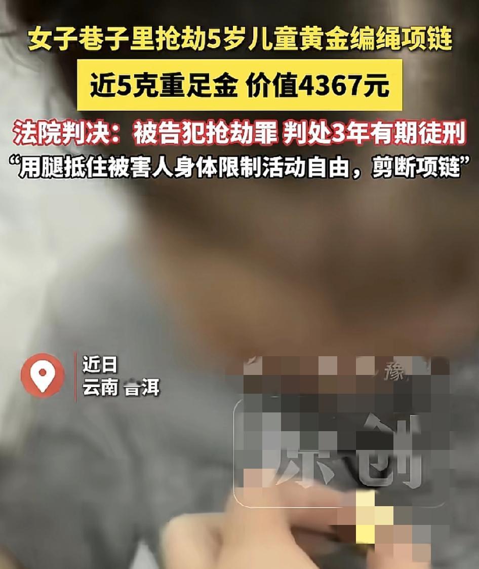 云南普洱一女子抢夺一名男孩脖子上的金首饰,被判处被以抢劫罪判。有期徒刑三年并处罚金。男孩是什么?脖子上挂的是带有金饰的手编绳子女子用腿抵住男孩脚部,限制其活动,然后剪下首饰。虽然对方得到了应有的惩罚,但是也提醒家长贵重的物品将尽量不要给孩子们挂在身上,尤其是出门在外,这样会引起一些不法分子的注意,很有可能伤害小孩子。