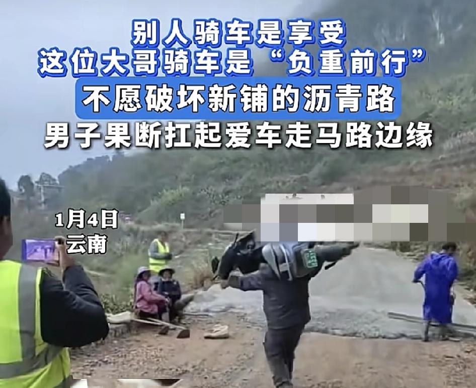 大爷扛着一辆电动车往前走,让网友觉得电动车本身是骑着享受的。大爷这操作让人感觉到是负重前行,原来大爷是为了不破坏刚铺好的沥青路,所以只好把车扛在肩膀上往前走了。这不得不让人佩服大爷的素质。有人不仅不爱护公路,还会故意破坏。