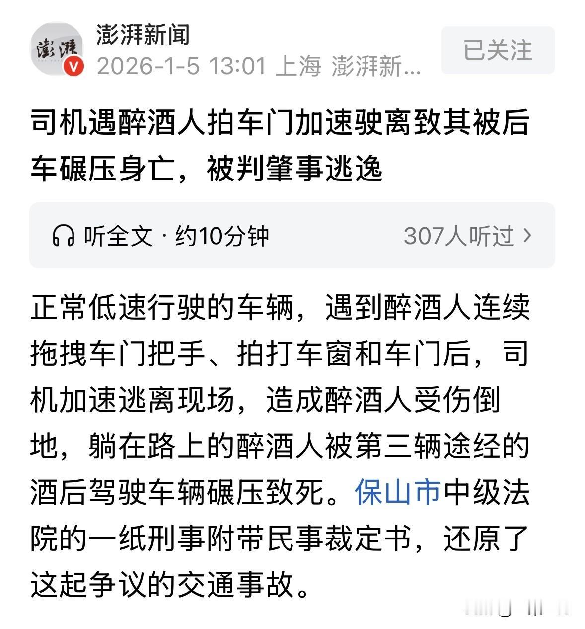 云南保山,男子凌晨在路上开车低速行驶,这时,路边一女子突然冲上来,不停拍打他的车窗,还拉拽门把手,男子见女子有些疯癫,吓得加速逃离,女子被带倒后,被车辆左后轮碾压受伤,男子却没下车查看,过了一会,他又回到现场,发现已有人报警,女子依然躺在原地,谁料,就在他跟报警人聊个天的功夫,出事了!一司机酒驾,途经时没看到躺在路上的女子,直接将其碾压致死。这下事情大了,到底谁负主责?法院这样判了。 2024年3月25号凌晨2点35分,花偎开着一辆丰田车沿着某条路由西向东走。 车开到离一处路口不远的地方,前头突然冒出来个人。此人是38岁的女子,李香。 这李香当时喝大了,整个人晕晕乎乎,正翻越路中间的隔离护栏。 根据后来的血检,她当时体内酒精含量高达176mg/100ml, 花偎看见有人,赶紧减速。谁知李香不但不躲,还冲着车过来了,对着车门和车窗一顿猛拍猛拉。 大晚上遇见这种事,花偎心里慌得一匹,觉得这女的怎么疯癫癫的?是不是要碰瓷啊? 花偎一紧张,脚底下没踩刹车反而踩了油门,车子嗡一下窜了出去。 就在车加速的时候,李香被带倒了,而且左后轮直接从她身上碾了过去。李香当场倒地不起,脑袋上全是血。 按理说,撞了人,得赶紧下车救人,可花偎看了一眼,没停车,一脚油门直接跑了。 2分钟后,也就是2点37分,一个叫朱鹏的好心司机路过。 他看见李香躺在路中间,吓了一跳,赶紧掉头回来,一边报警一边站在路边挥手,提醒后面的车别撞上。 到了2点44分,花偎可能是内心太忐忑,放心不下,居然又把车开回来了。 他把车停在路边,下来跟报警的朱鹏聊了几句,但也没去看伤者,更没把人送医院。 就在这节骨眼上,又出事了。 2点46分,喝了酒的李某非开着一辆长安轿车过来了。 这哥们儿车速不慢,大概有53码。朱鹏看见车来了,拼命挥手示意停车,可李某非好像没看见似的,车子直接从躺在地上的李香身上碾了过去。 这一下,让原本还有活路的李香,当场就没气了。 事后,李某非自己报了警。而那个先撞人的花偎,一看撞死人了,又开车溜了。 直到早上4点多,他才磨磨唧唧报警,说是去配合调查。到了中午,警察一个电话把他叫到了交警队。 到了局子里,花偎开始耍赖。他跟警察说:我当时是被吓到了才加速的,我也不确定是不是我撞死的。监控也没拍清楚,我车上也没血迹。 他甚至翻供说,当时感觉到车颠了一下,但说不定是压到石头了,不是压到人。 他觉得自己不算肇事逃逸,更不该负主责。 但交警看完监控,不这么认为。花偎先是减速,李香拍车,然后他加速,李香倒地,车颠簸了一下。而且第一次事故后,李香已经头破血流动不了了。 交警最后定责:花偎撞人后跑了,这是“逃逸”,负主要责任。李某非酒驾超速,负次要责任,李香自己醉酒翻护栏,也负次要责任。 花偎不服,觉得自己冤枉,还要去复核,结果上级公安维持原判。 案子到了法院,花偎和他的律师坚持做无罪辩护,说花偎不构成交通肇事罪。 而另一个司机李某非也觉得委屈。觉得明明是花偎先把人撞倒的,凭啥我要赔钱?我酒驾是不对,但主要责任不在我啊! 《刑法》第133条规定:违反交通运输管理法规,因而发生重大事故,致人重伤、死亡或者使公私财产遭受重大损失的,处三年以下有期徒刑或者拘役;交通运输肇事后逃逸或者有其他特别恶劣情节的,处三年以上七年以下有期徒刑。 花偎虽然辩称“不确定是否刮擦到人”,但监控显示其明知发生事故后,未停车查看反而加速驶离。 花偎的行为符合“交通运输肇事后逃逸”。正是因为他逃逸,导致现场变动、责任无法完全查清。 法官审理认为,虽然花偎撞了人,但没法证明李香的致命伤是第一次撞的还是第二次撞的。 也就是说,有可能花偎撞的那一下已经把人撞成重伤救不活了。 所以,检察院指控花偎“因逃逸致人死亡”这一条不成立,不能判得太重。 但是,花偎撞人后跑了,这已经够得上交通肇事罪了,而且这一条已经用来定罪了,量刑时就不能再拿“逃逸”这事加重处罚了。 考虑到花偎后来赔了家属16万精神损失费,也拿到了谅解书,法院最后给了个轻判:有期徒刑1年2个月。 2025年9月30日,一审判决下来:花偎坐牢1年2个月,保险公司赔18万,花偎自己还要再掏35万多。 至于李某非,也要赔26万多。 俩人都不服,觉得判重了,又上诉。到了12月10号,中院二审直接驳回,并维持原判。 这起案子算是尘埃落定了。 这也告诫所有人,路上撞了人,哪怕对方是酒驾、是闹事,你只要敢跑,这性质就全变了,不仅钱得赔,还得吃牢饭! 法律推定其承担主要责任,如果没有“逃逸”这一情节,单纯的一次碰撞,且无法证明致死,可能只属于民事纠纷或行政违法,正是“逃逸”行为将其升格为刑事犯罪。 对于这件事,你怎么看? 欢迎关注@一案一论