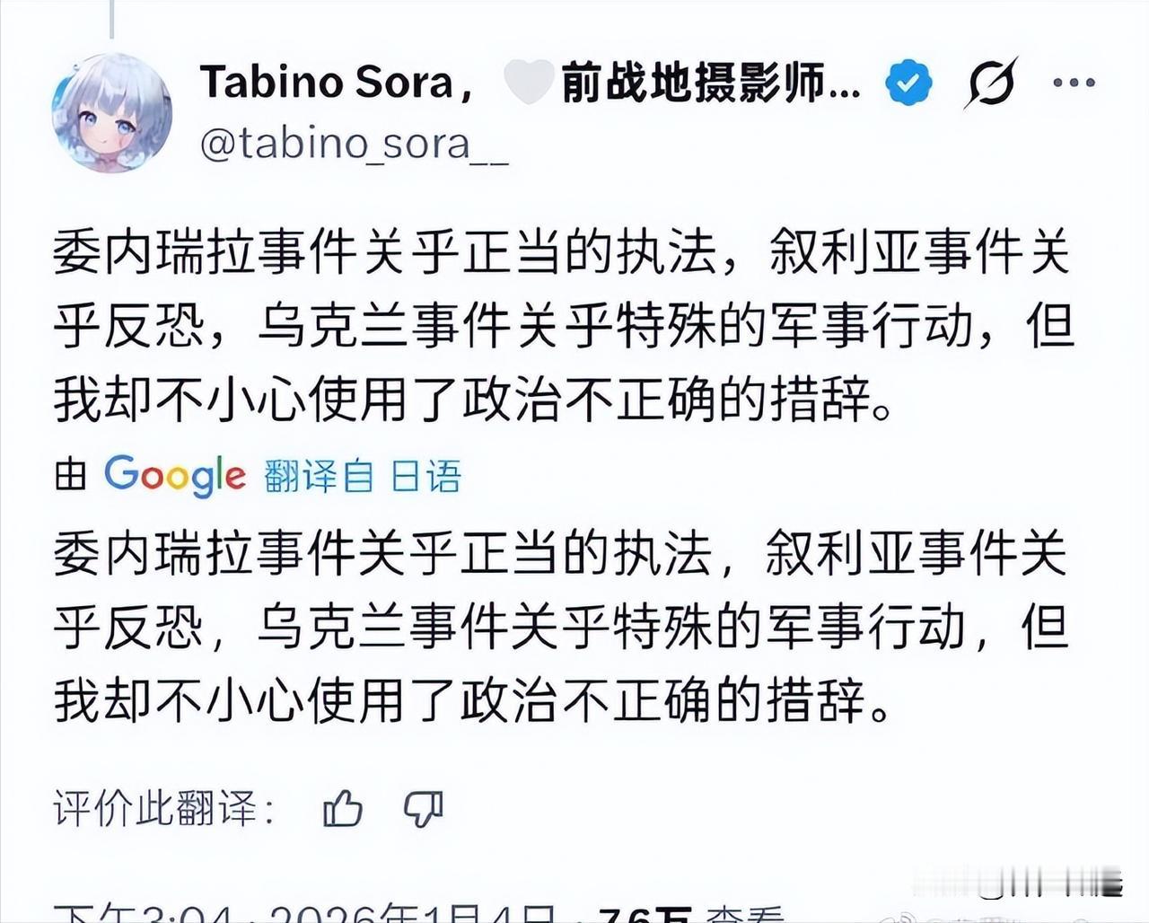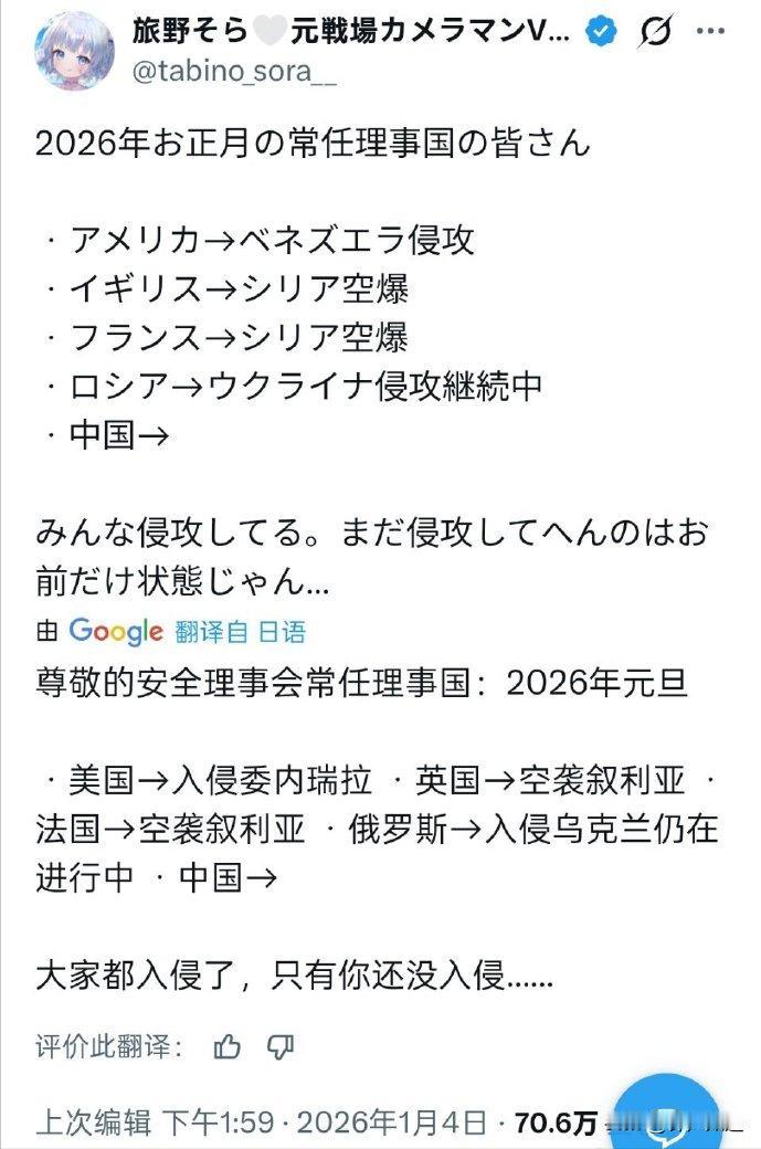 2026年一开年,联合国五常里只有中国正常。 美国以所谓执法的名义突袭委内瑞拉, 又对格陵兰岛、古巴、哥伦比亚发出了战争威胁。 英国、法国继续反恐,轰炸叙利亚, 俄罗斯对乌克兰“特别军事行动”仍在继续, 目前只有中国没有对外发动任何形式的战争。 2026年注定是不平静的一年, 希望我们也有所突破。