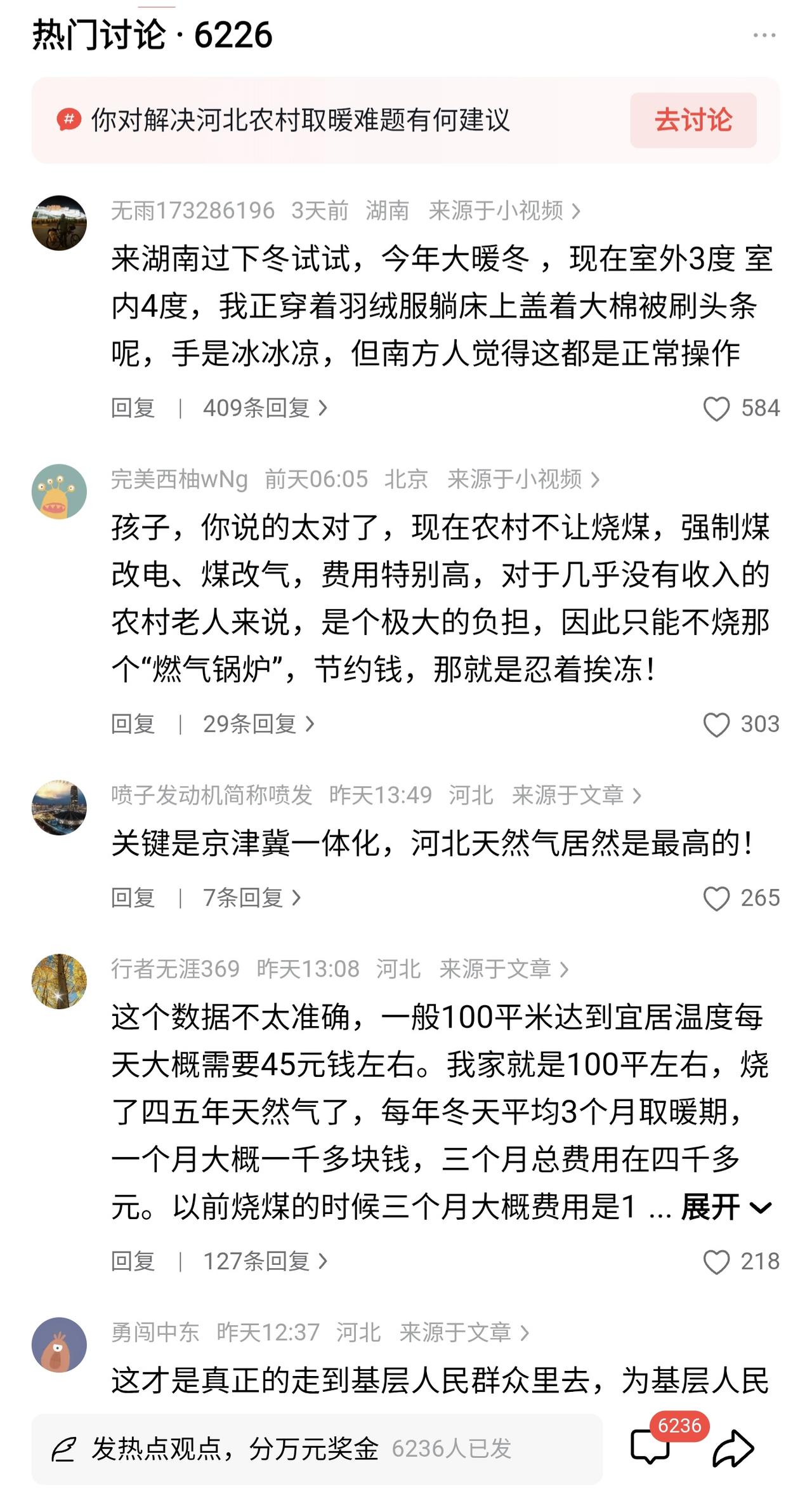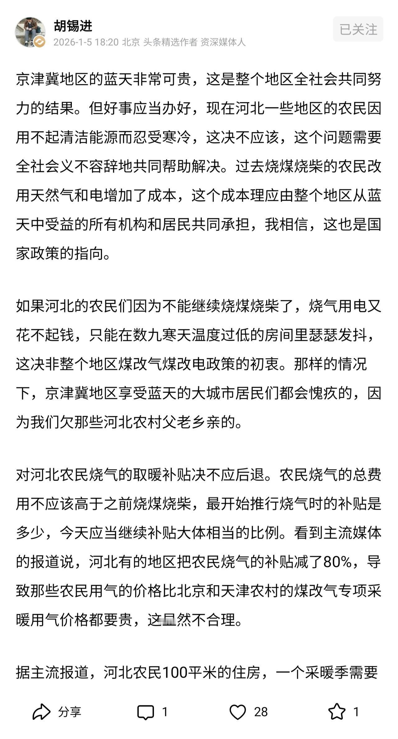 胡锡进:北京和天津应当为河北农民的取暖成本买单。 刚刚刷到新闻,看到河北农村取暖问题上了热搜,引起了网友的热议,网络大V也纷纷表态为河北农民鸣不平。 要知道问题的产生在于环保,为了蓝天白云,农村地区相对价格低廉的煤炭和秸秆等传统燃料被禁用,然后不得不用价格更高的天然气。有的媒体统计农民家庭一个冬季的取暖费用要7560元到11340元,而2024年河南农村人均可支配收入才22022元,这个燃气费用可以说是农村不可承受之重,那有什么办法呢?只要挨冻硬挺了! 如果说为了环保要农民面临挨冻的牺牲其实大可不必,我们也许可以选择让老百姓更有温度的方式去解决问题,环保很重要,老百姓的福祉一样重要。政府不妨加大努力提供清洁廉价的能源材料,让环境更美好,让老百姓更温暖。 看到有河北网友评论,天然气价格河北居然是最高的,北京高收入地区天然气才2.6,河北低收入地区却是3.15。这个天然气价格是不是确实有点离谱呢? 看到很多新闻报道和网友讨论,大家都没有提出一个确切的方案,但是我觉得@胡锡进 老师的观点值得参考,北京和天津享受着河北地区煤改气带来的环境改善,还享受着比河北地区更加廉价的天然气。那么何妨从这两座城市入手,展现一下友邻城市之间的守望相助,为河北农民分担一些供暖成本。