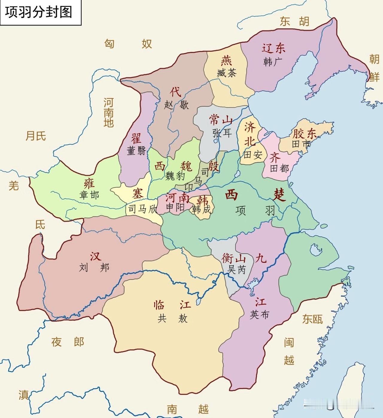 一图看懂项羽分封十八诸侯分布图,项羽所在的西楚国既包含家乡江东(大后方),又占据了中原淮北四战之地(战略要地),同时与11诸侯国直接接壤,一旦诸国有事,都可以快速率军威慑镇压,从中也可以看出,项羽心里是知道无论是否公平分封诸侯国,总会有人不服的,就看谁忍不住先跳出来,而项羽的西楚国在地利上占据了优势,这也是项羽分封前就规划好的。 当然,这一切的前提是项羽一直保持强大的武力和实力,一旦处于劣势,西楚国就成了人人喊打的四战之地,迟早败亡。 冬日生活打卡季 军事历史