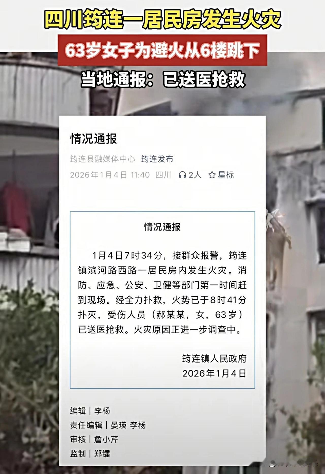 宝子们,看到这个新闻我心都揪紧了! 1月4日四川筠连县一居民房突发火灾,一位女子为了避火坐在6楼窗外的空调外机上,结果不慎坠落!现在官方已经通报伤者被送医了,希望她能平安啊。 火灾发生时的自救方法真的不能错,这可是关乎生命的大事! 宝子们,你们都知道哪些火灾自救的小技巧?评论区说说!