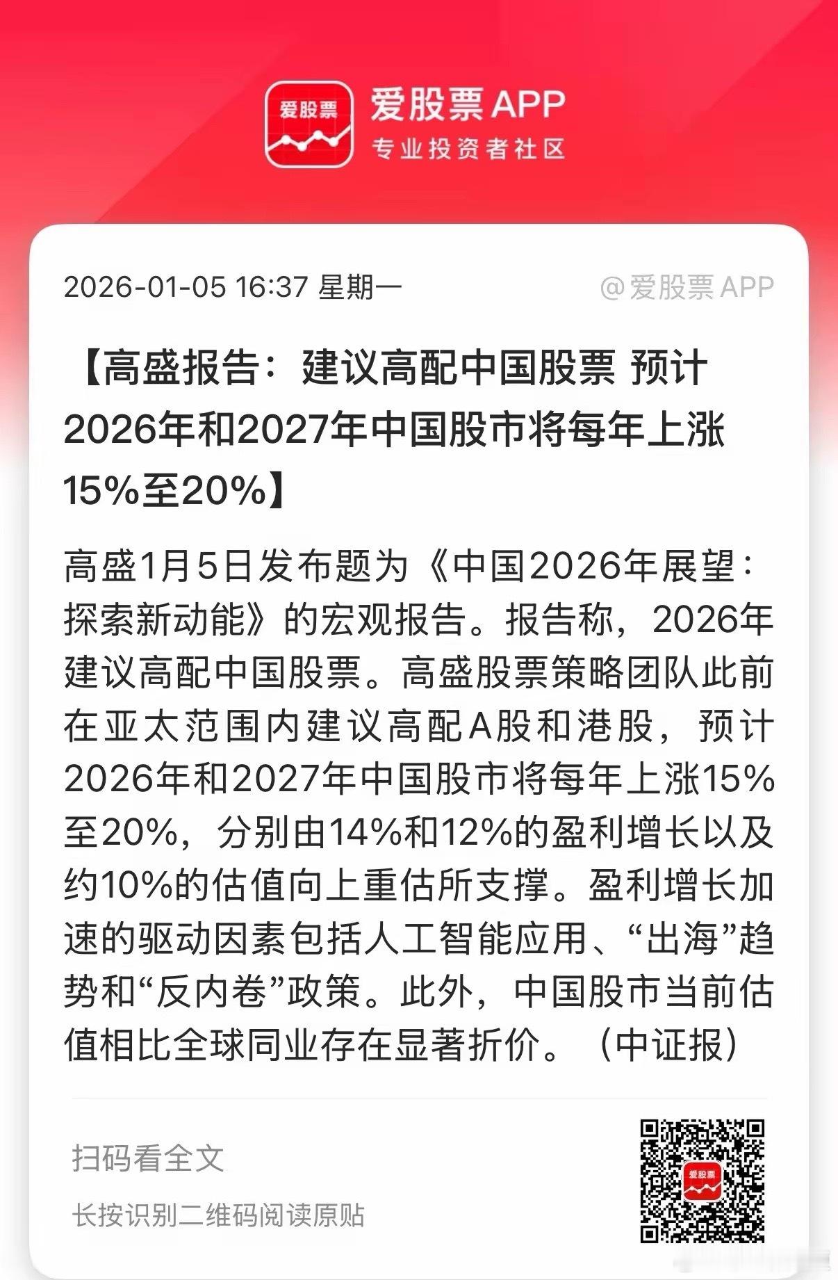 市场刚进入2026年,就有国际投行迫不及待预测中国股市的上涨空间。其报告称,2026-2027年中国还可以再涨15%至20%,按其上涨幅度计算,A股可以涨到4800点左右!看来2026年A股又能复制2025年的走势了。参照这家国际投行对去年测试数据看来,其准确性极高。意味着A股2026年股市继续上涨行情不会改变,值得期待!