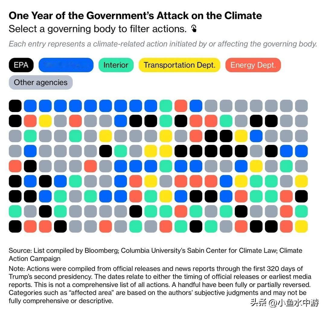 在过去的一年里,特朗普政府至少在180个方面,对环境与气候相关政策进行了削弱或推翻。其举措涵盖了从放宽污染管控、抑制可再生能源发展,到清除政府文件里有关气候科学表述等内容,将过去数十年的政策成果瞬间清零。 依据彭博社的统计数据,自特朗普就职以来,已实施了近300项直接或间接削弱气候政策的具体行动,这俨然是一场有组织、有指向的破坏行动。 这股气候政策的“清算浪潮”仍在持续蔓延。美国联邦政府带头倒退,实际上为企业和其他国家提供了政治借口,使得原本勉强维持的气候承诺迅速变得岌岌可危。煤炭使用量开始回升,电动车转型的步伐放缓,气候目标也不断被淡化,但这也是特朗普践行到底的能源务实主义体现。