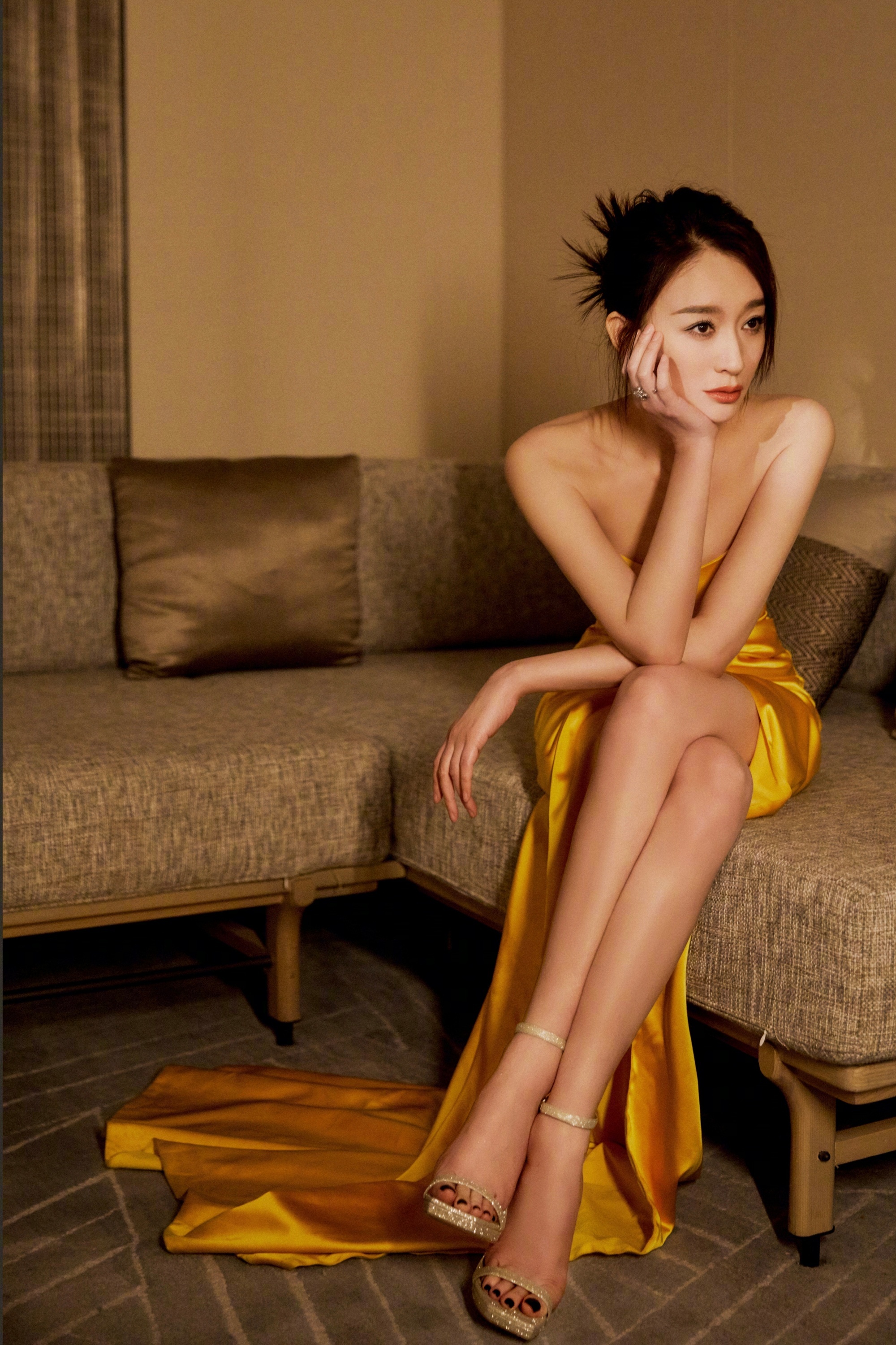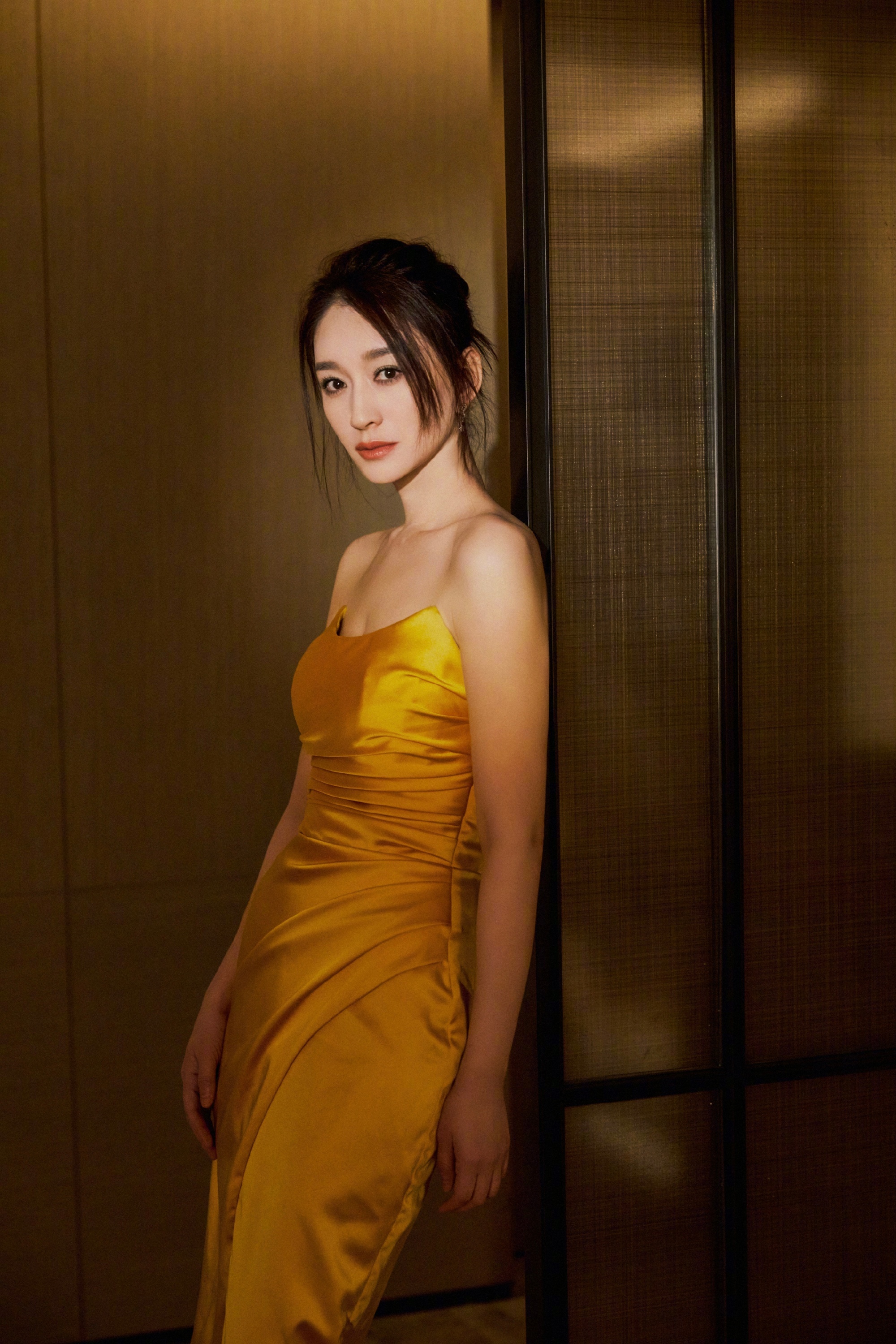 李小冉,金色抹胸裙,优雅静谧。李小冉