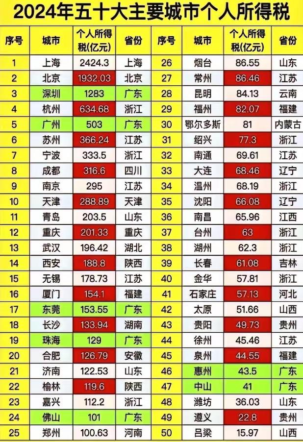 个税 城市 2024年全国缴纳个税的50个城市中,江苏有6个城市上榜。其中,苏州排名第6,超越成都;南京位列第9,力压天津;无锡排在第15,名次高于厦门;常州处于第27,纳税情况优于昆明和福州;南通位居第32,超过大连和温州;徐州处在第44,领先泉州和中山。而浙江有8个城市上榜,相较江苏更为亮眼。 江苏 浙江 南京 苏州