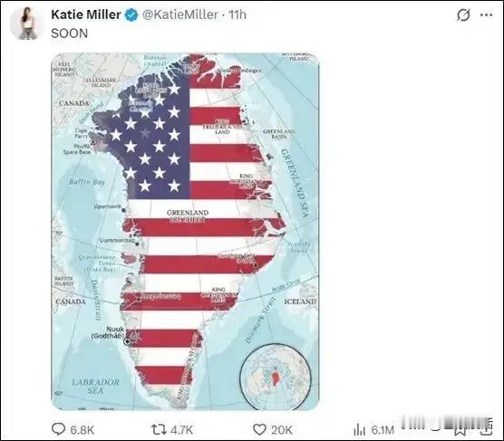 2026年1月3日晚,美国保守派网红凯蒂·米勒在X平台上发布了一张美国国旗覆盖格陵兰岛地图的图片。她还在图片上配文“很快(SOON)”。 由于凯蒂·米勒的丈夫斯蒂芬·米勒是白宫核心幕僚,再加上特朗普也曾多次发表“我们绝对需要格陵兰岛”,并保留动武选项的言论,凯蒂·米勒的此帖很快便引发了格陵兰自治政府总理与丹麦驻美大使的强烈不满,也引发了广大网友的关注。 网友普遍关注美国是不是真的要“拿下”格陵兰岛。 有的网友认为,可能极低,理由是: 1.从主权和法理上讲,格陵兰是丹麦王国的自治领地,外交与国防由丹麦管辖,另外,国际社会与联合国宪章也不支持美国以武力改变其领土归属。 2.格陵兰自治程度高,“公投”手段难以奏效,并且当地民众坚决反对“被美国化”。 3.采取武力会遭到美国盟友和俄罗斯的坚决反对。 4.美国国内,包括国会、军方与舆论对动武“拿下”格陵兰岛存在严重分歧。 然而,也有部分网友认为可能性极大,理由是: 1.格陵兰的北极航道、稀土与矿产、军事基地(如图勒基地)等价值太重要,美国觊觎已久。 2.美国政府,尤其是特朗普政府向来无视国际法和联合国宪章,漠视他国主权,坚持美国优先原则,没有什么事做不出来。 3.美国为一己之私惯于滥用武力,尤其是刚刚轰炸委内瑞拉并逮捕了其总统,正在风光之上。 亲爱的友友,您认为呢?美国占格陵兰岛 格陵兰地缘战略