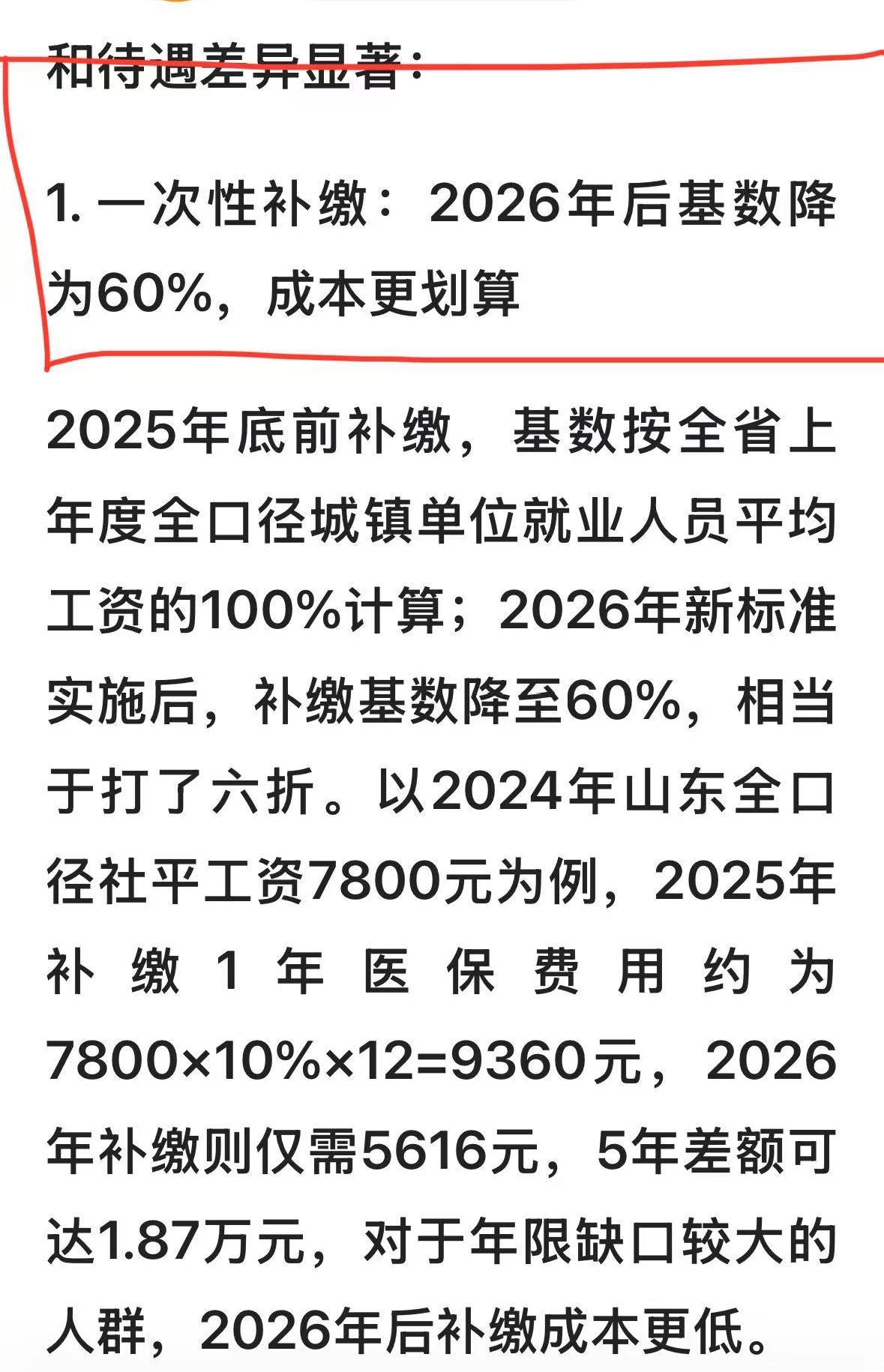 山东医保大变天,补与不补,都是意难平! 2026年山东医保新政落地, 职工医保最低缴费年限从男25年、女20年统一上调至男30年、女25年,凭空多出的5年要求, 让那些临近退休的人心碎一地! 补与不补都成了最煎熬的选择,2026年前补缴基数按全省平均工资100%算,2026之后退休的,补缴不再按照100%而是降至60%,但年限却长了5年,看似打了个6折,实际缴费总体差别不大。 我特意打电话咨询了当地社保,工作人员告诉我,有三种方式可供选择。第一,一次性补齐,终生享受退休医保,退休即可领取独生子女费每月100元,第二逐月补缴,但享受的是在职职工的报销比例,而且独生子女费只能在60岁之后再领,第三,放弃,之前投的全部作废。 总而言之,就是想方设法的让大家一次性补上,有钱的补,没钱的也要创造条件补。在山东,尤其青岛,一个收入低消费高的城市,医保补缴却比任何地方都狠。 有人说,在青岛生活,幸福指数top1,我就问,幸福在哪里?