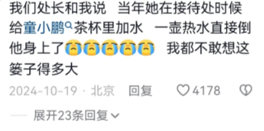 我们处长和我说, 当年她在接待处时候给童小鹏茶杯里加水 ,一壶热水直接倒他身上了,我都不敢想这篓子得多大