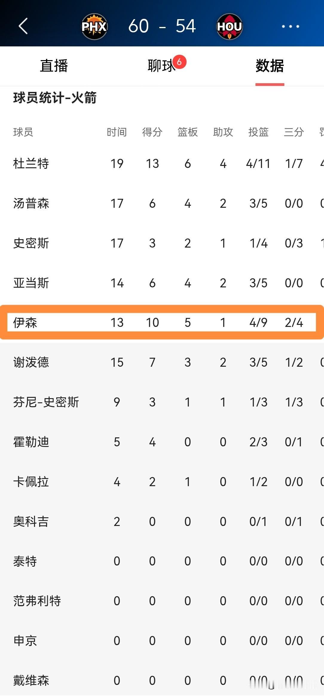 我忍不住要怒赞火箭大将伊森!在今天进行的火箭和太阳的焦点战中,目前双方的上半场比赛已经结束,火箭暂时以54:60落后于对手。虽然火箭处于落后,但是伊森却打出了非常精彩的表现。 在前两节比赛中,伊森首发出战13分钟,投篮9中4,其中三分球4中2得到10分5篮板1助攻,没有出现失误和犯规。 在我看来,伊森是火箭在上半场比赛中表现最好的球员之一。