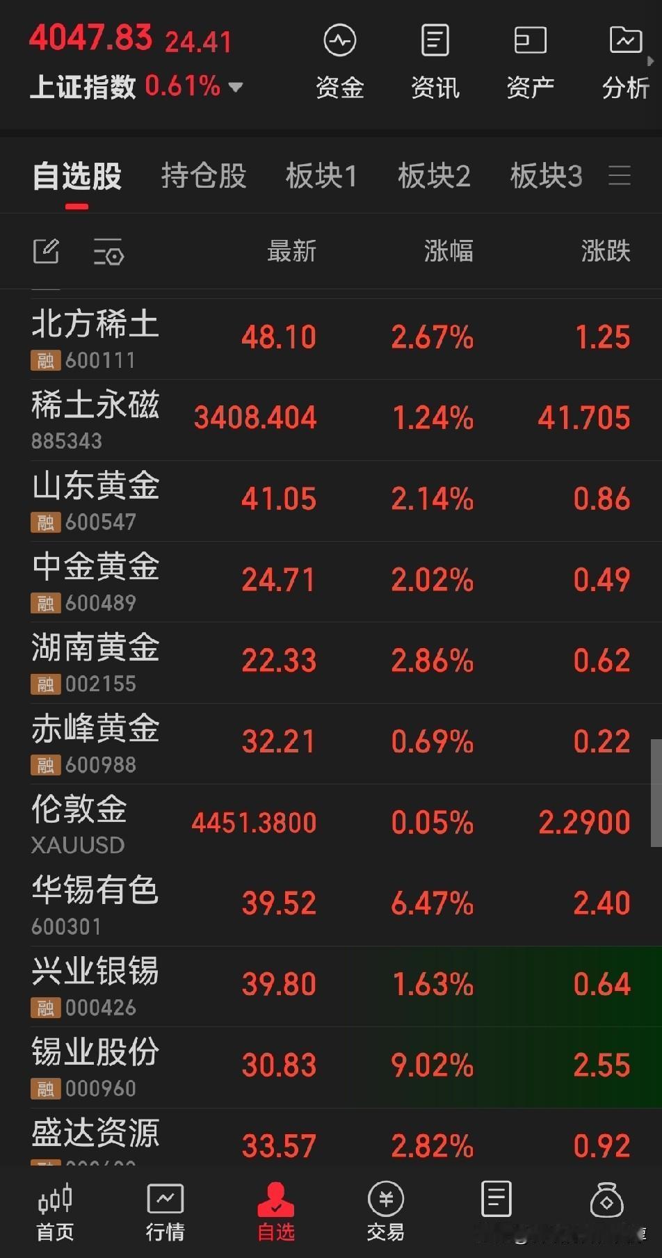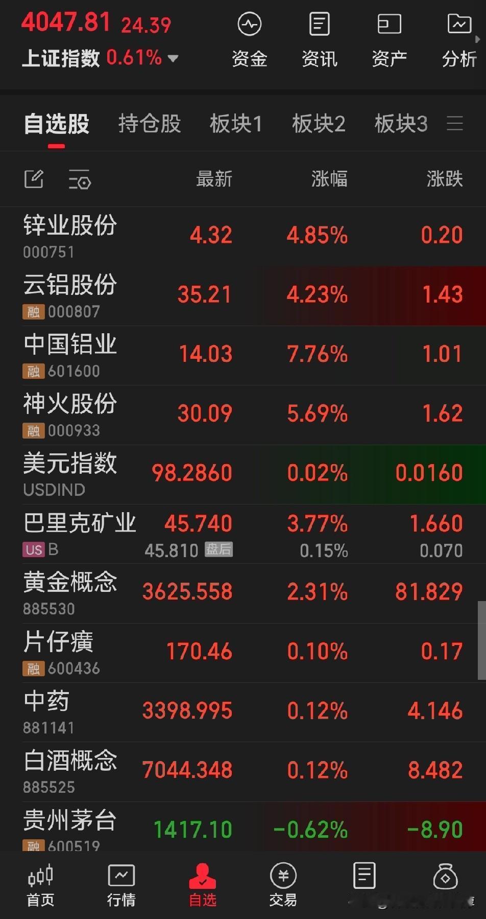 铜、铝、金、银、锌、锡…大有色的浪终于漫延开了。与之相适应的,大量的水,估计也要放出来了。 云南铜业、中国铝业、锡业股份的腰杆子也开始硬起来了。 没有经历过周期股的周期的朋友,自己小心,这是一匹烈马,能不能驾驭得了,完全看自己。