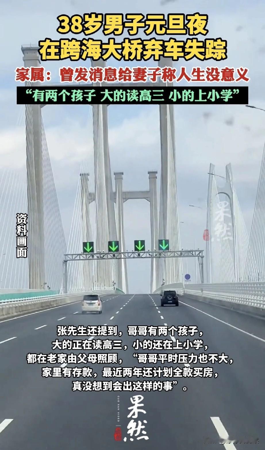 谁能想到,压垮一个中年男人的最后一根稻草,不是房贷车贷,不是职场刁难,而是老婆一句再寻常不过的“劝洗脚”? 元旦这天,本是欢欢喜喜辞旧迎新的日子,福建泉州湾跨海大桥的应急车道上,那辆亮着双闪的车却成了全网牵挂的焦点:38岁的河南大哥,在福建打工二十年,却在一场拌嘴后失联五天,至今杳无音信。这场看似荒唐的“逃离”,藏着多少成年人不敢言说的情绪崩溃? 这位大哥的日子,在外人眼里其实过得不算差:家里有存款,已经计划着全款买房,两个孩子都在老家由父母悉心照顾,大的即将参加高考,小的还在上小学,压根没有什么明显的经济压力。可偏偏就是这么一件鸡毛蒜皮的争吵,成了压垮他的最后一根稻草。更让人心疼的是,他停车的时候还特意打开了双闪——这个细节足以说明,就算情绪已经崩溃到极点,他心里依然想着别影响别人,骨子里是个多么替人着想的人。 在我看来,这事最让人难受的地方,就是成年男人的情绪内耗太容易被忽略了。社会总给中年男人贴上“扛事儿”“坚强”“不能软弱”的标签,好像他们就该是无坚不摧的超人,就该把所有压力、委屈、疲惫都悄悄憋在心里。可他们也是普通人啊,也有撑不住的时候,也会渴望被理解、被倾听,这些真实的情绪,从来不会因为他们是男人、是中年人就自动消失。那些看着不起眼的小事,从来都不是突然爆发的导火索,不过是长期情绪憋闷后的一次总爆发罢了。 真心希望这位大哥能早点被找到,平安回到家人身边。也希望这事能给所有人提个醒:关心身边人的情绪,从来都不是一件小事。多花点时间听他们说说话,多给一份理解和包容,少一些理所当然的要求,说不定就能帮那些陷在情绪泥潭里的人,打开一扇透透气的窗,让他们知道,自己从来都不是一个人在扛。