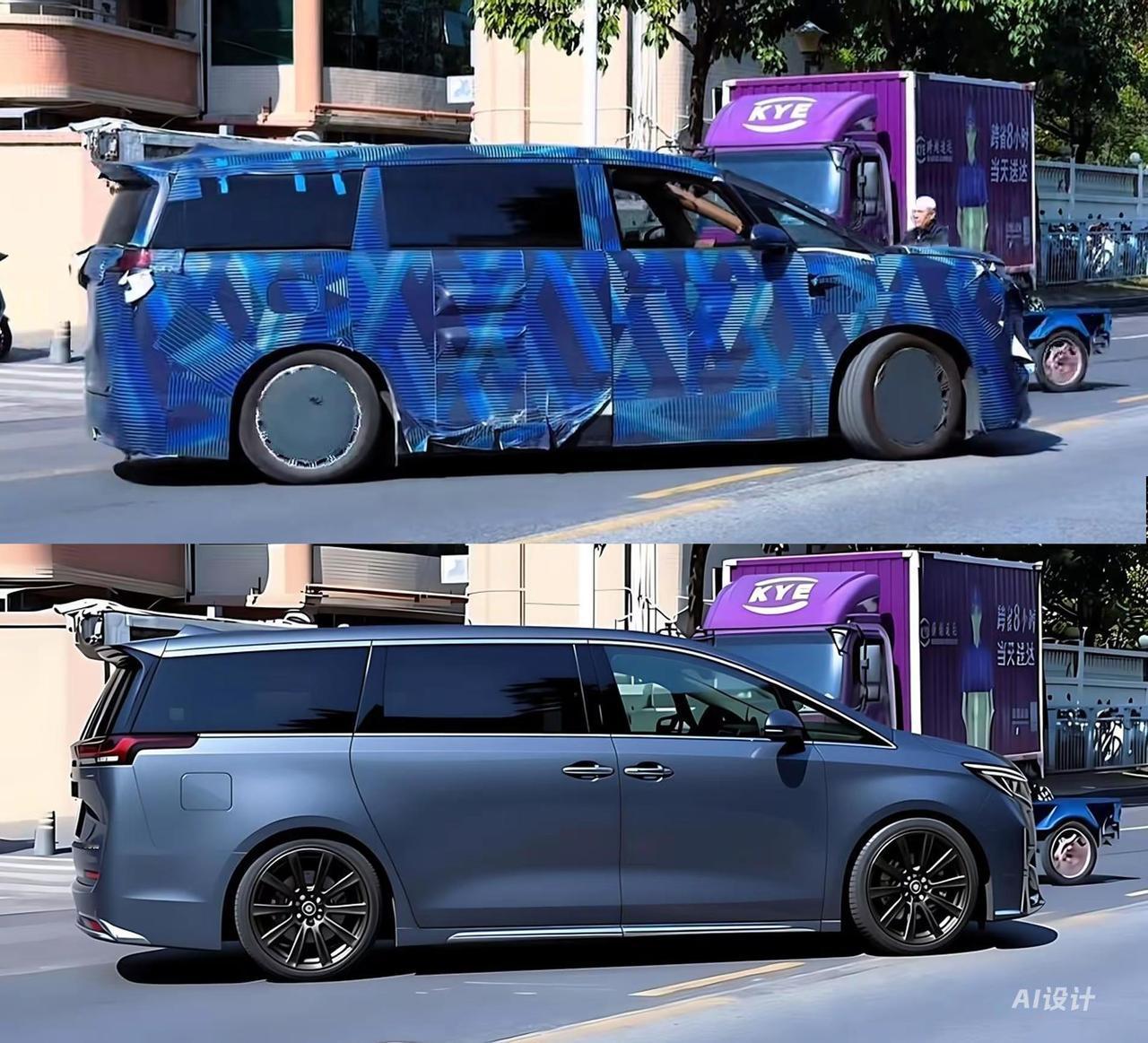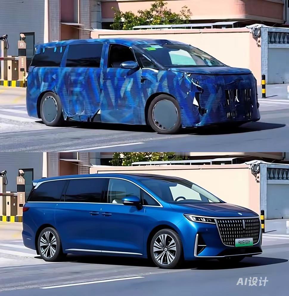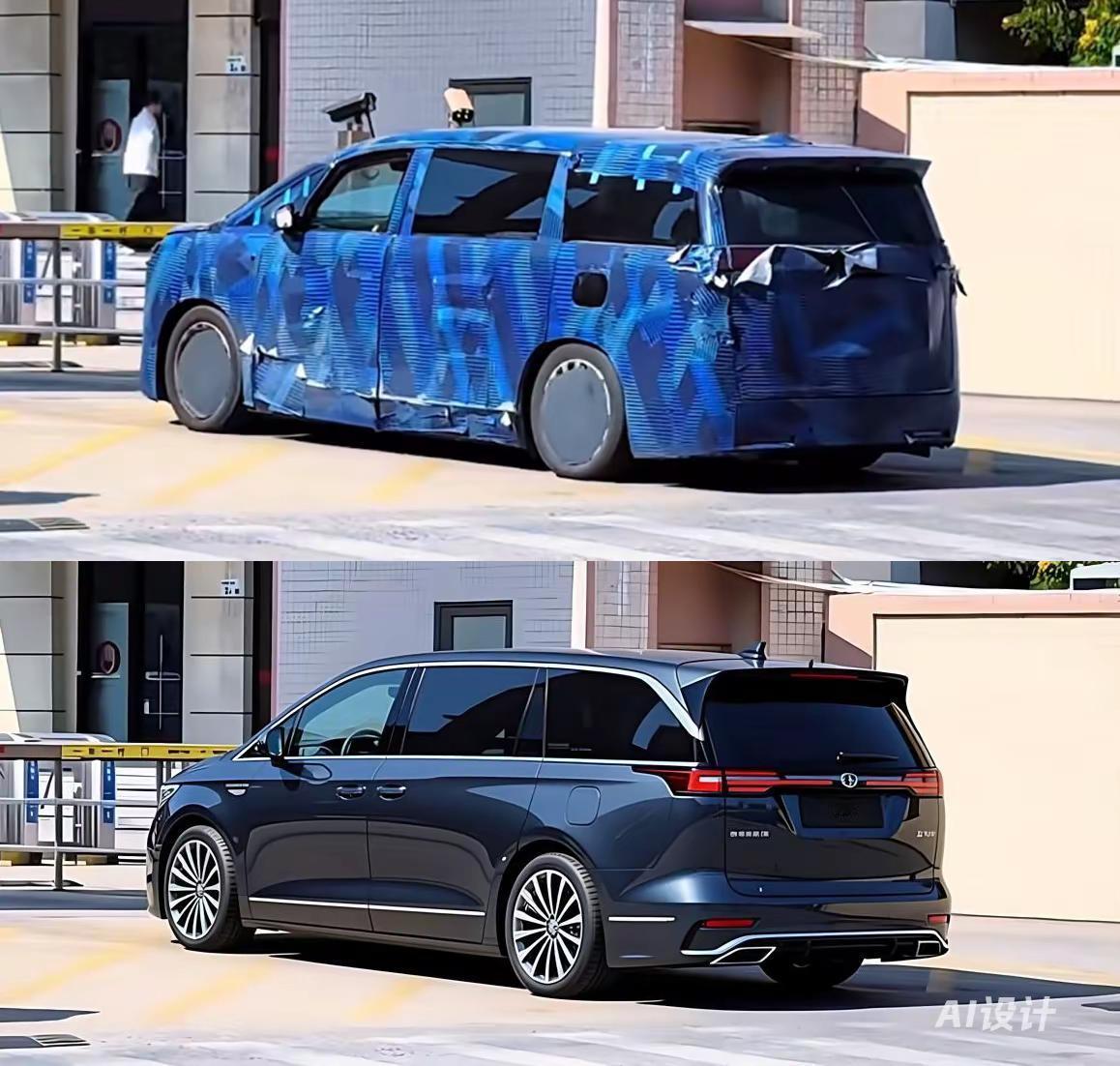 腾势D9L最近不是曝光了它的路试谍照吗?那咱们趁热乎,我们用Ai给他剥去伪装,用Ai软件来给他做一个设计。我选的三张图,主要是正侧面、尾部和正斜侧面, Ai软件这个东西啊比较随机,咱们就纯粹的出于爱好和分享。从完成度和车型的匹配度上去看我个人觉得啊,正侧面那张图,Ai设计的和原来的这个轮廓是比较相近的,并且它做出来的这个配色和悬浮车顶以及轮毂的搭配很有高级感,同时从侧面来看呢,因为看不到太多的一些彻头彻尾的细节,所以它其实这张图,我觉得已经接近一张比较标准的官渲图了。还有一张图,虽然他没有撕掉伪装贴纸,但我单独给他做了一个轮毂,虽然这个五辐式的轮毂比较的传统,但是在细节上,我让它做成了电镀银的效果,所以看起来还是很有质感的。你们觉即将用Ai生成的腾势D9L,哪张最好看啊?