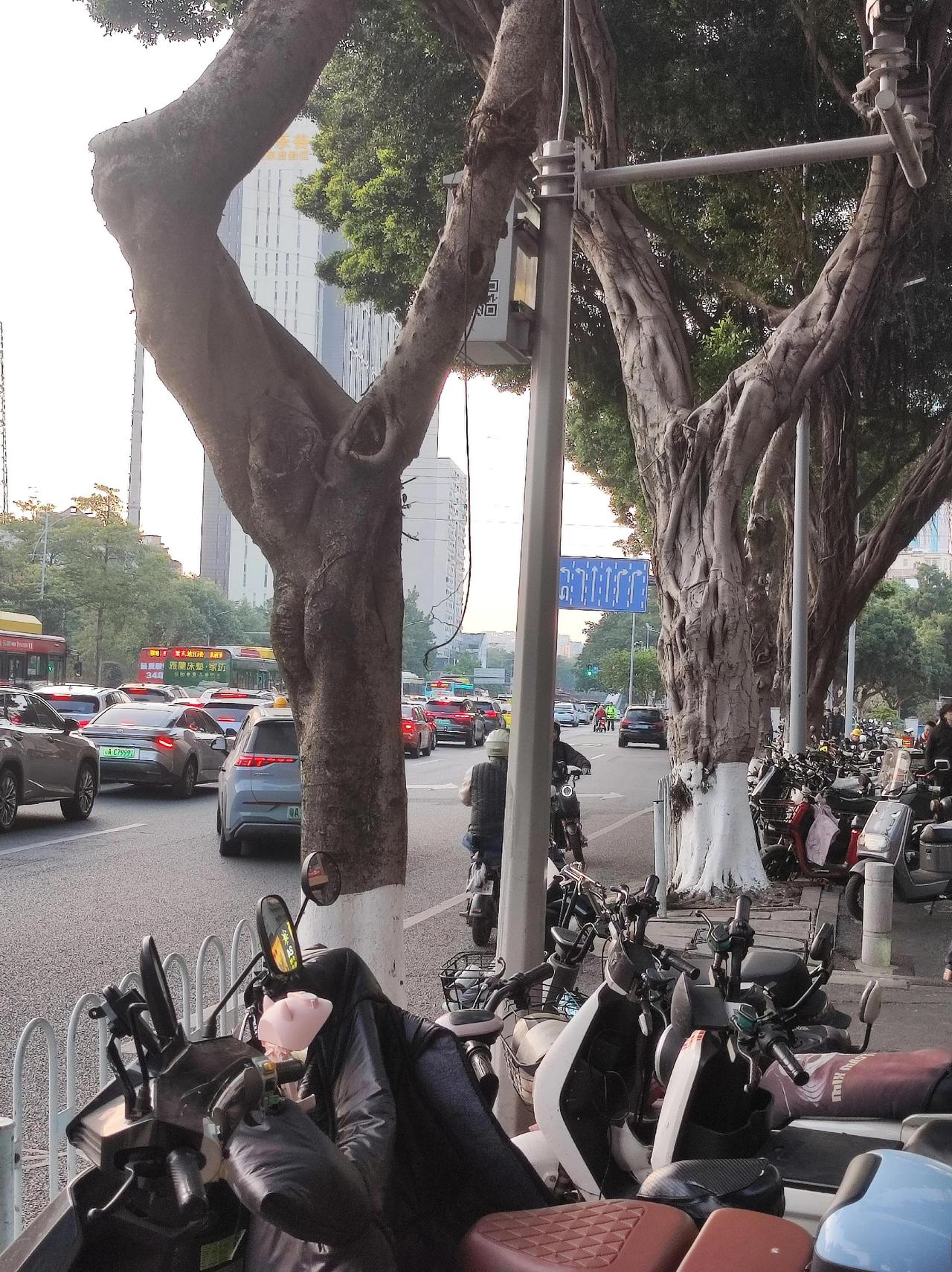 宁静的午后,阳光洒在石板路上,静谧的停车区,绿意盎然。