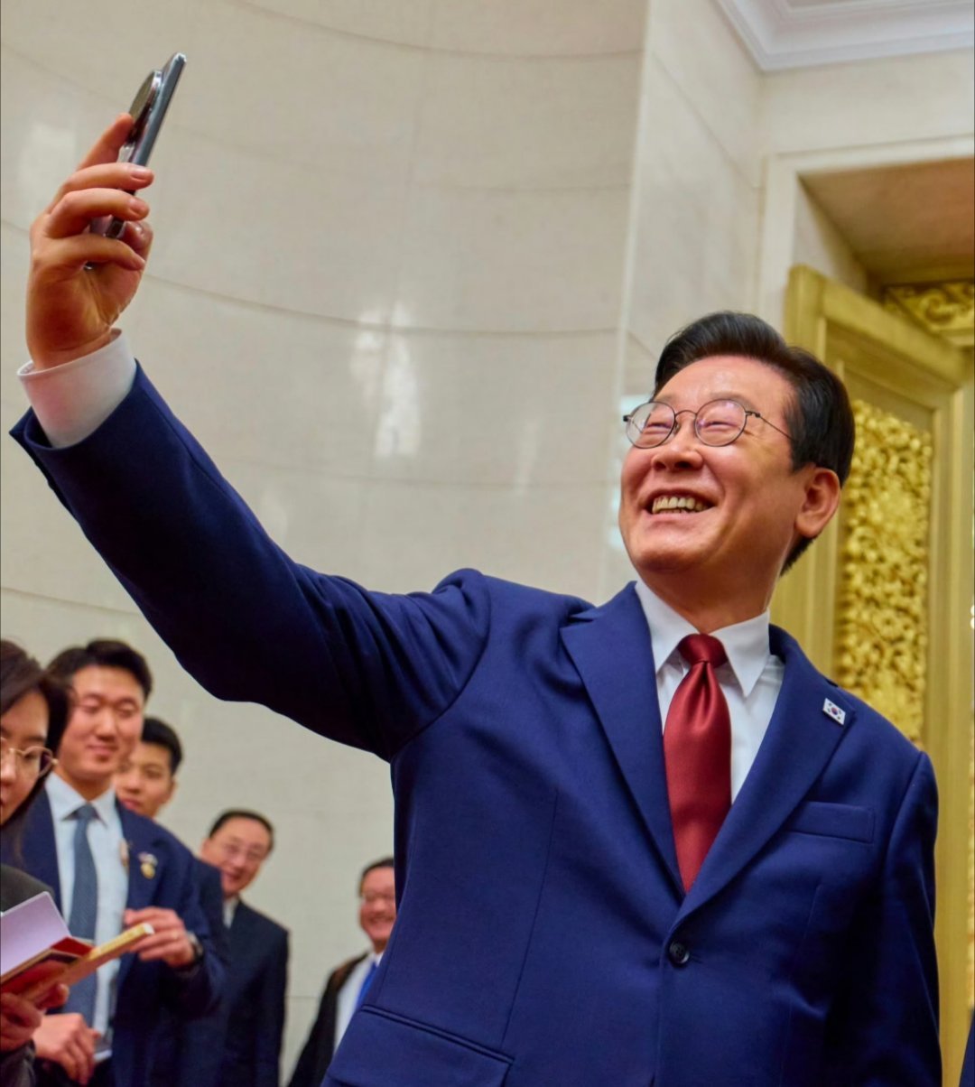 李在明发布了他在人民大会堂的自拍照,用的手机是小米15Ultra。李在明自拍热点