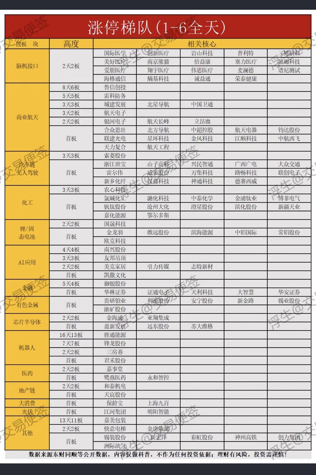 1.6周二 涨停板股票:题材分布! 1.脑机接口 19股涨停 2.商业航天 21股涨停 3.无人驾驶 15股涨停 4.化工原料 13股涨停 5.电池相关 7股涨停