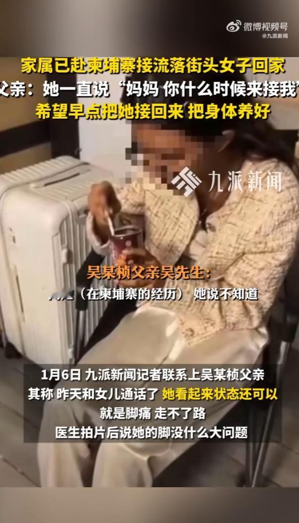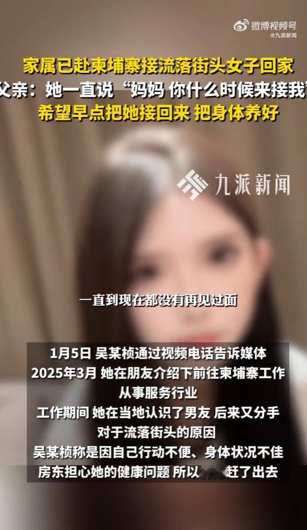 柬埔寨流浪女网红父亲发声:女儿一直说想回家,忘记在柬流浪经历…… 备受关注的流浪柬埔寨女网红,目前到底是怎么样?她什么时候回国? 1月6日,九派新闻采访了女网红吴某桢父亲及母亲,他们透露了更多细节: 其一,吴某桢是在2025年3月被朋友通过“高薪工作”诱骗过去柬埔寨,随后就从事服务工作,后来谈了一个男朋友,随后分手了。 其二,而为什么吴某桢会流浪在柬埔寨街头?据吴某桢母亲透露,2025年12月26日她接到了女儿房东的电话,说女儿状态不好,这时候吴某桢母亲知道女儿吸毒,且2个月没下床了,随后转了2000元给房东,让房东带女儿出去看病,随后当天下午就有吴某桢流浪街头的照片。 其三,媒体及舆论关注,1月3日下午,吴某桢被驻柬埔寨领事馆工作人员找到,随后就送到医院治疗,目前,吴某桢身体问题比较多,肺部感染、胸膜炎、胸腔积液、尿潴留等,但整体状态还是可以,脚痛走不了路。 其四,吴某桢回国意愿非常强烈,联系上家人之后,就一直询问什么时候去国外接她,目前,1月6日中午吴某桢堂哥及母亲已经出发去柬埔寨了。 接下来就静待吴某桢回国了。 看到吴某桢的经历可以说是心痛,在国内好好的,为什么要去国外受这个罪,在国内至少是健康的,不会受xidu的罪。 据说吴某桢母亲及侄子的机票都是借钱买的。希望吴某桢好运,回国之后好好改造,不要让她父母这么为她担心了。