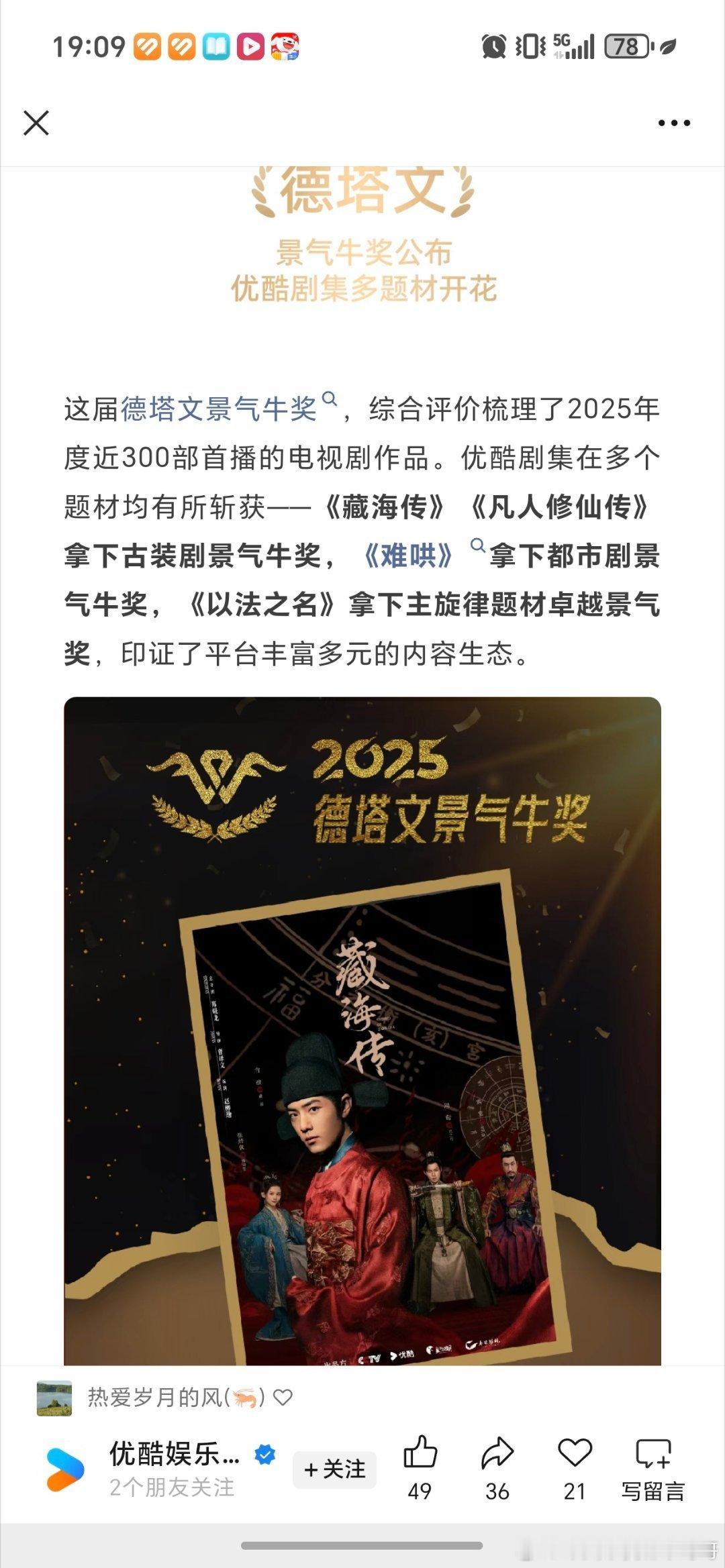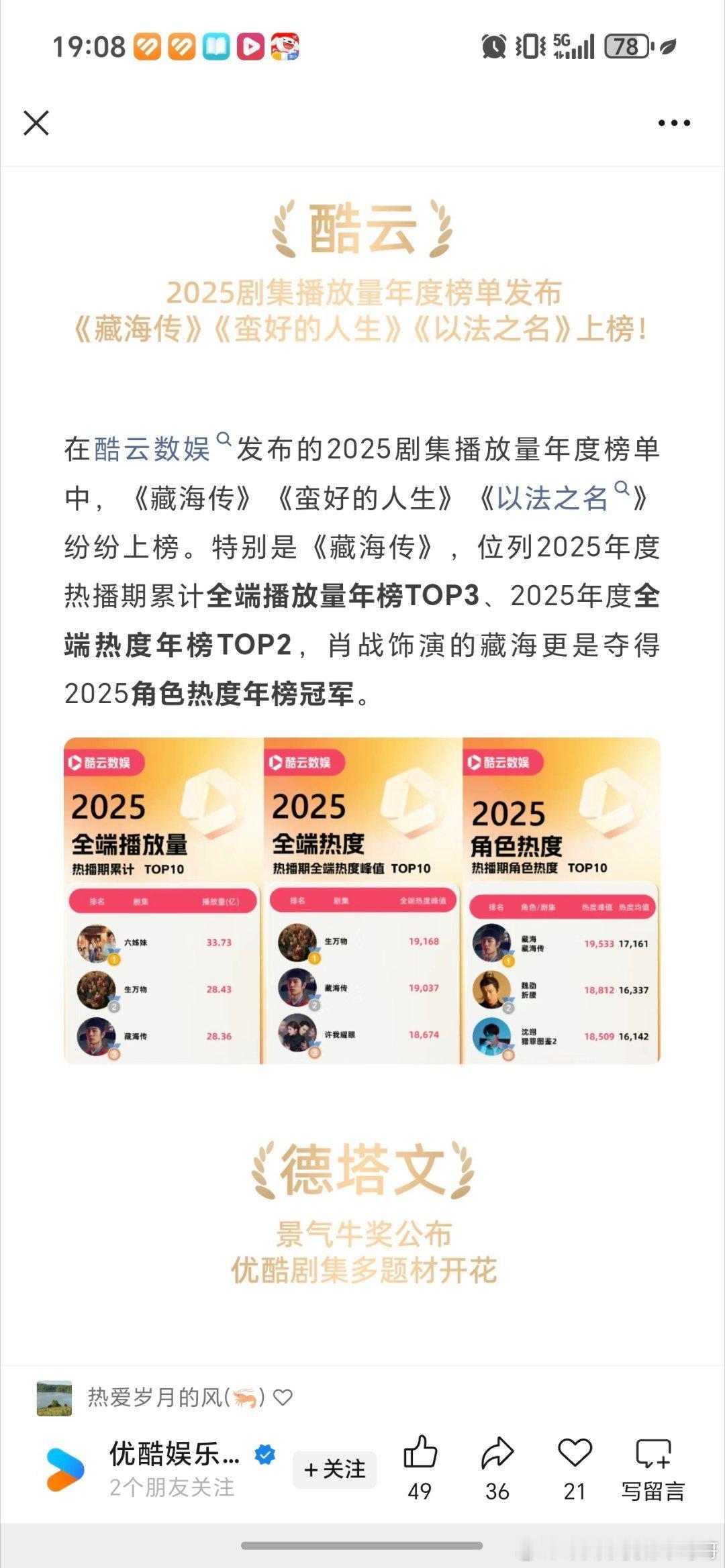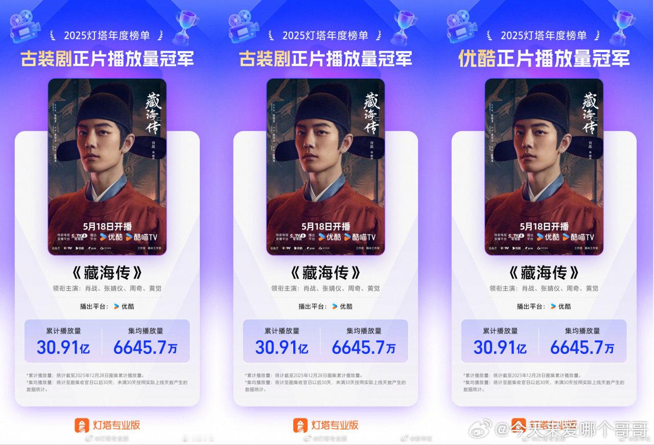 优酷的年终总结写成藏海传专题报道了,继续写长文夸藏海传,字字句句都是藏海传,新华社认证,猫眼、灯塔、云合、酷云、德塔文全面登顶,横扫冠军🥇🥇🥇剧王-肖战的藏海传让优酷过了个丰年,从未这么扬眉吐气过!