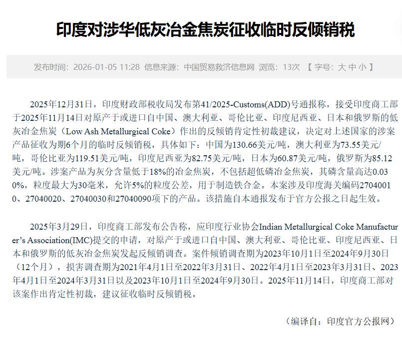 印度又来搞事情   1月4日,印度财政部突然官宣:给中国低灰冶金焦炭加税130.