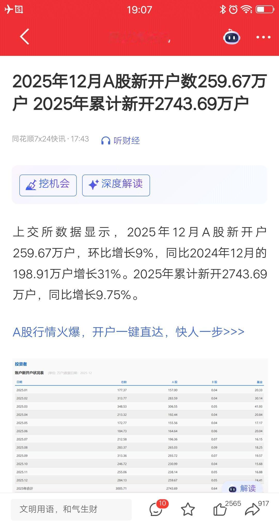 A股开户数量持续增加,散户跑步进场 最新数据显示,12月新增开户近260万 去年全年累计开户数近2744万 照这个速度增长下去,很快就到3亿了 有个投资大佬在街边使用擦鞋服务 鞋童给他推荐股票,大佬听后立刻回到公司 把所有的股票仓位全卖了 成功的躲过了股市大崩盘 人声鼎沸的时候,往往是最危险的时候